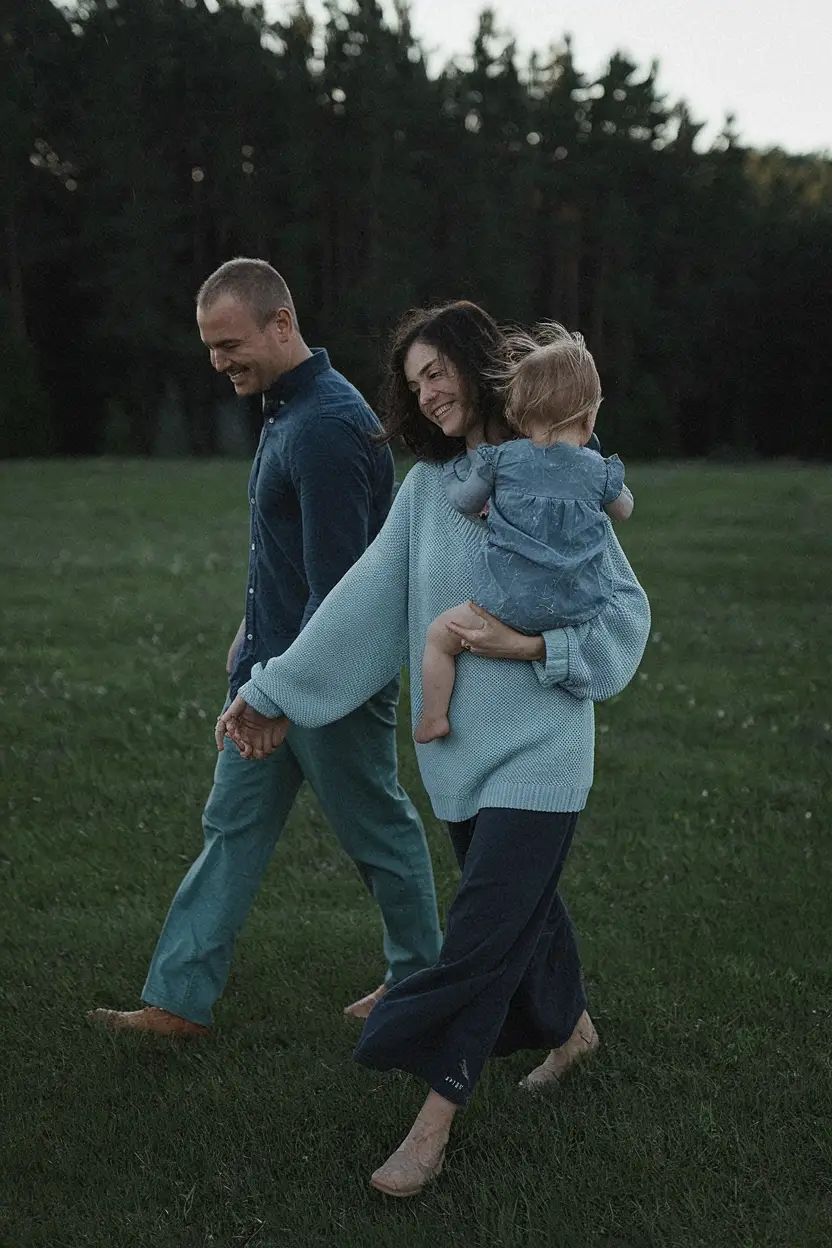 Mom is in a sweater that is too big and wide-leg trousers in faded navy, and dad is in a denim-buttoned shirt and teal pants. The toddler’s flutter-sleeve denim romper adds just enough sweetness. It is a soft evening-light color scheme with no harsh contrasts – perfect in case you want your background to do some storytelling as well.
