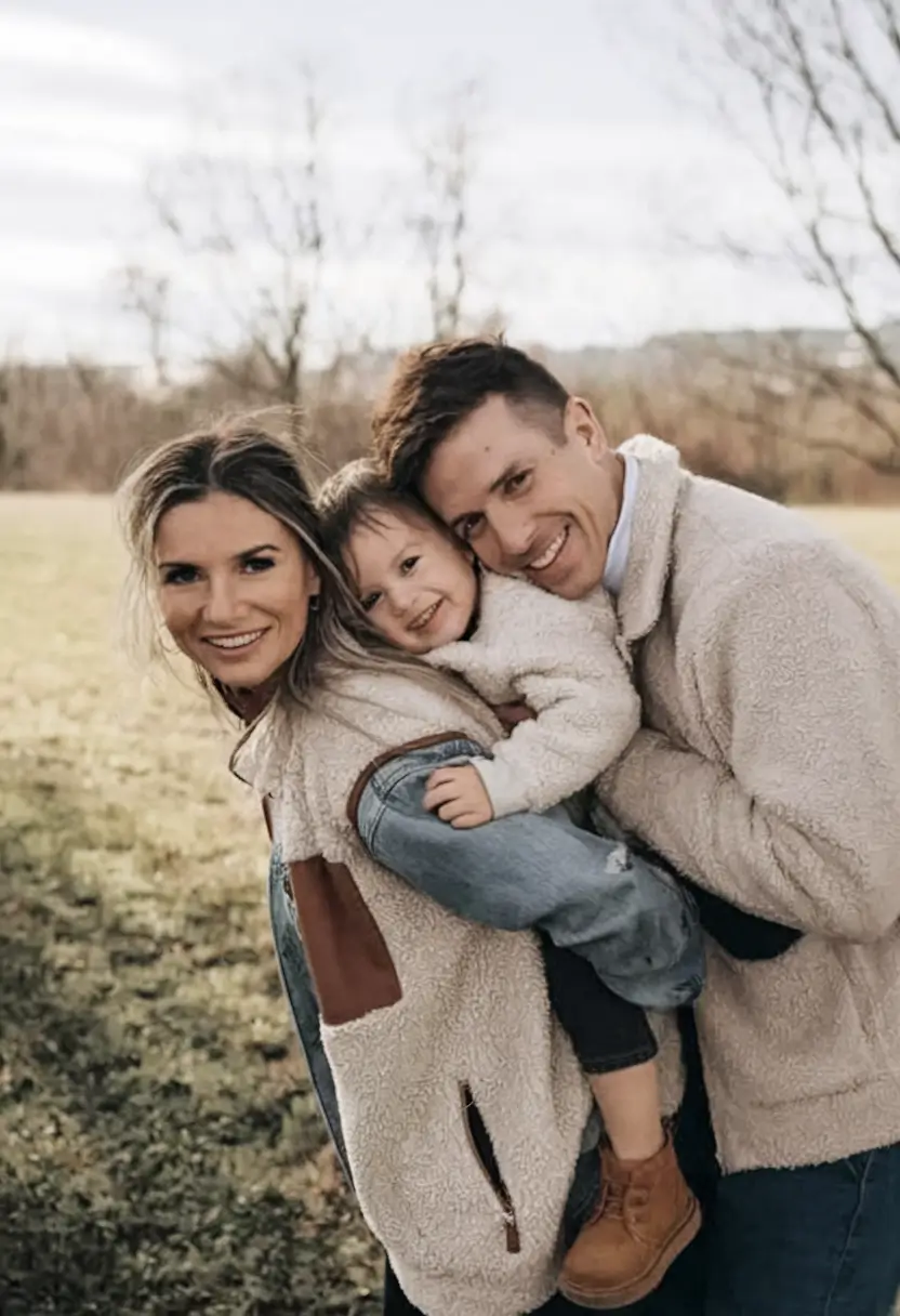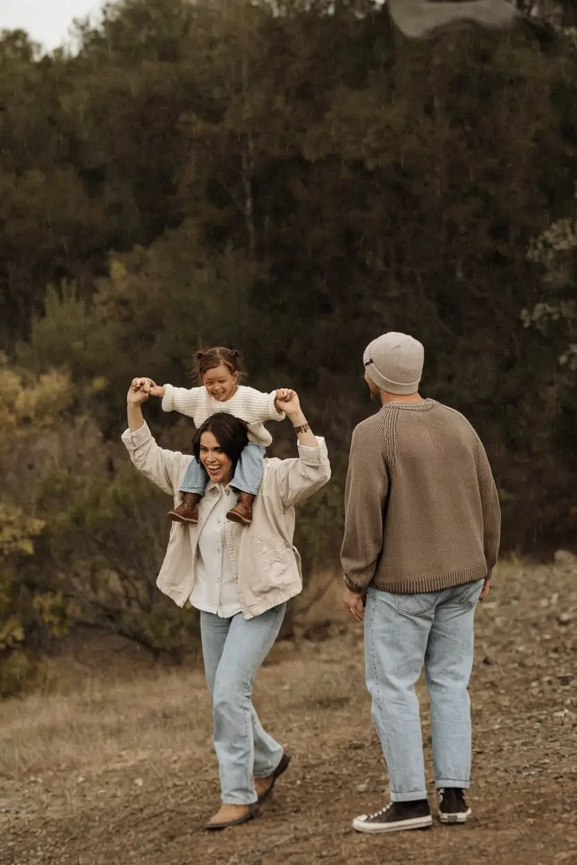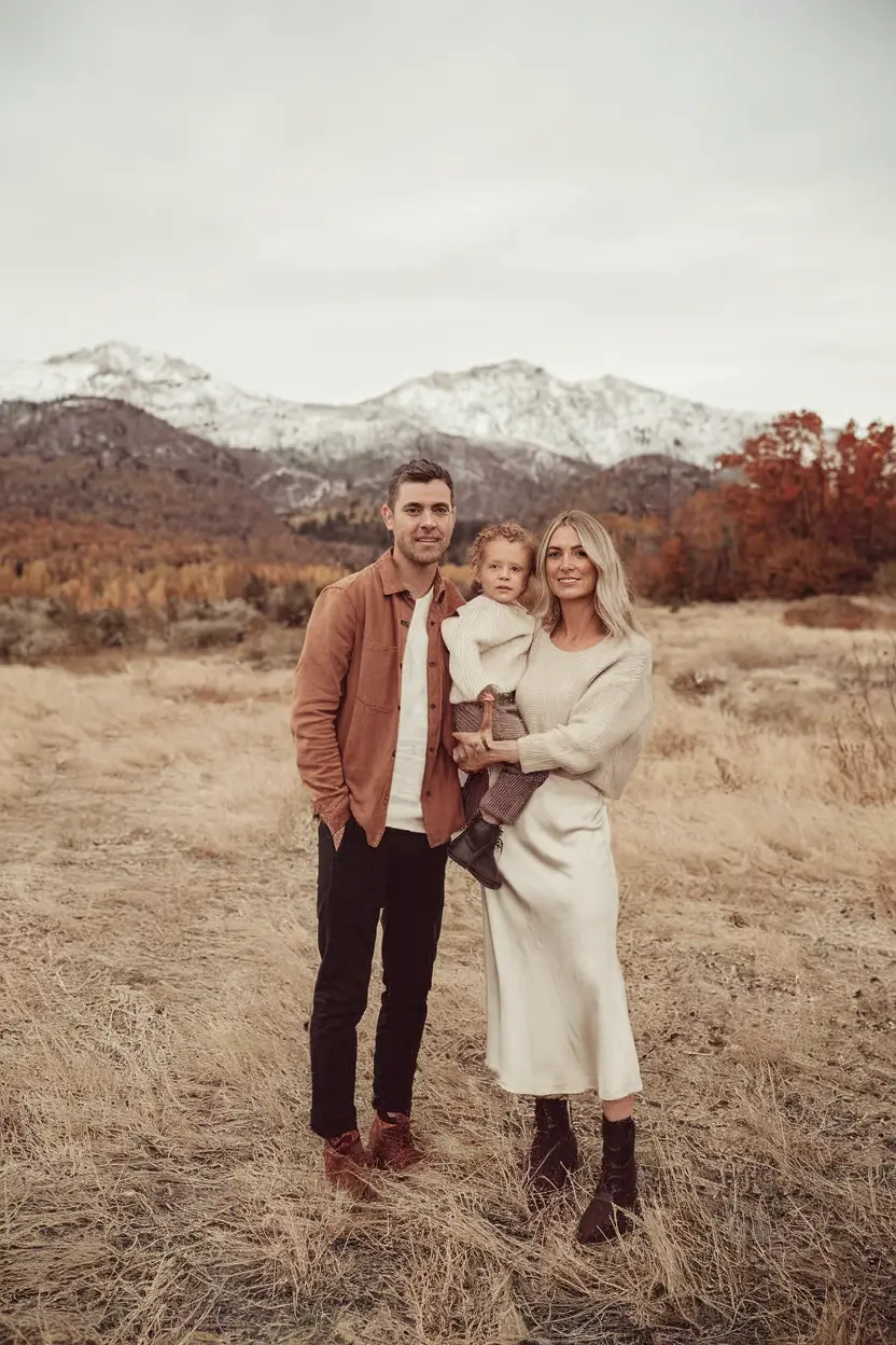 Mom is dressed in a stone-colored quilted coat and a blouse of creamy color and jeans and dad in a soft brown knit and cuffed faded denim. The toddler is dressed in sherpa and boots, the type of texture combo that does not even have to make the effort to steal the frame. This is ideal to use in transitional weather and soft overcast lighting.