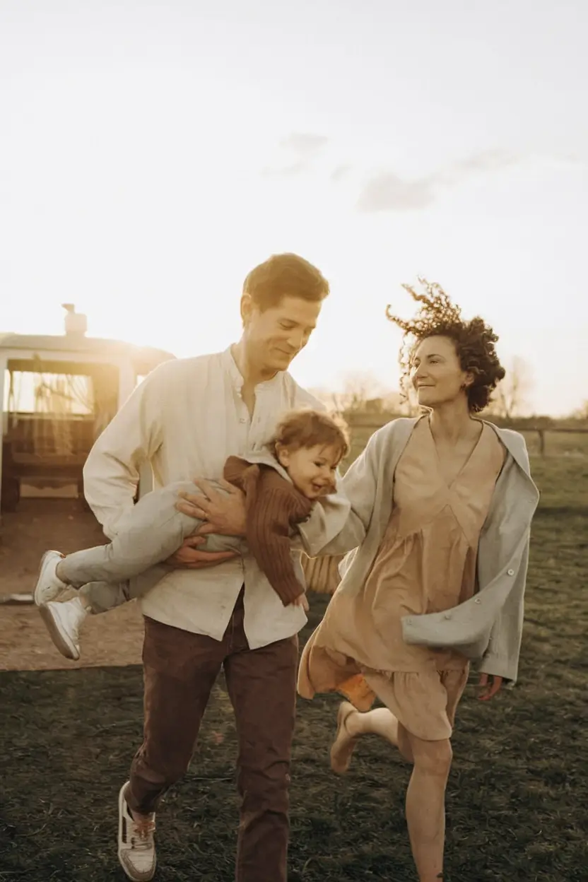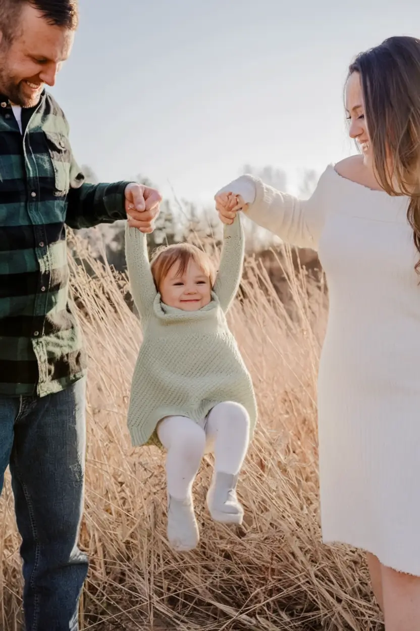 The young girl in this sun kissed picture is happily swinging between her parents in the air where each of the parents hold one of her hands. The field of grass is the golden light that surrounds them and makes the place look like magic as a simple, sweet family moment.