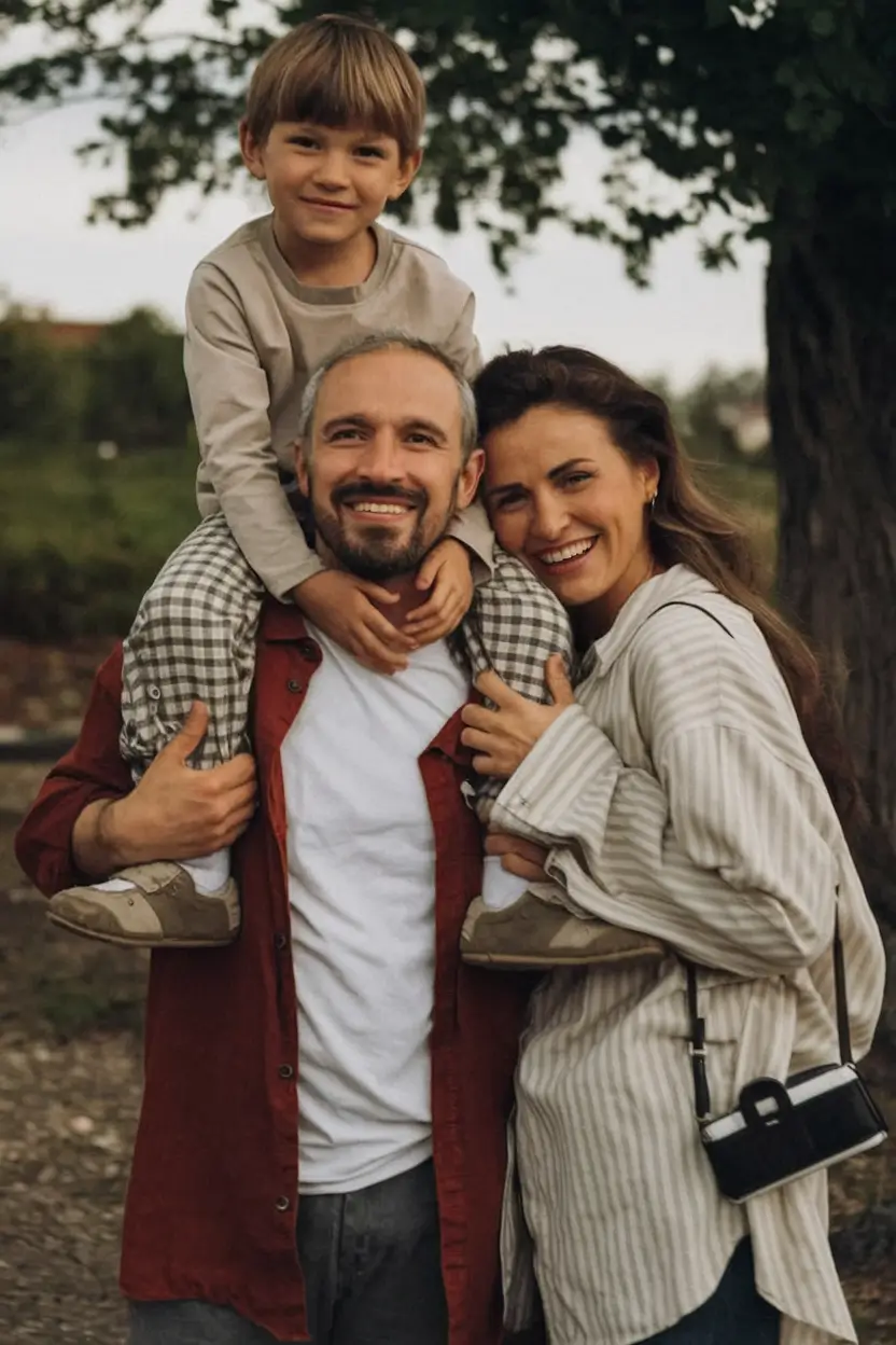 This is a picture of a cozy and friendly family of three hugging under a tree with leaves. The father is proudly standing in the middle with a happy little boy on his shoulders and the mother is affectionately embracing both of them. The background is rather earthy and natural, suggesting a quiet countryside or a forest border.