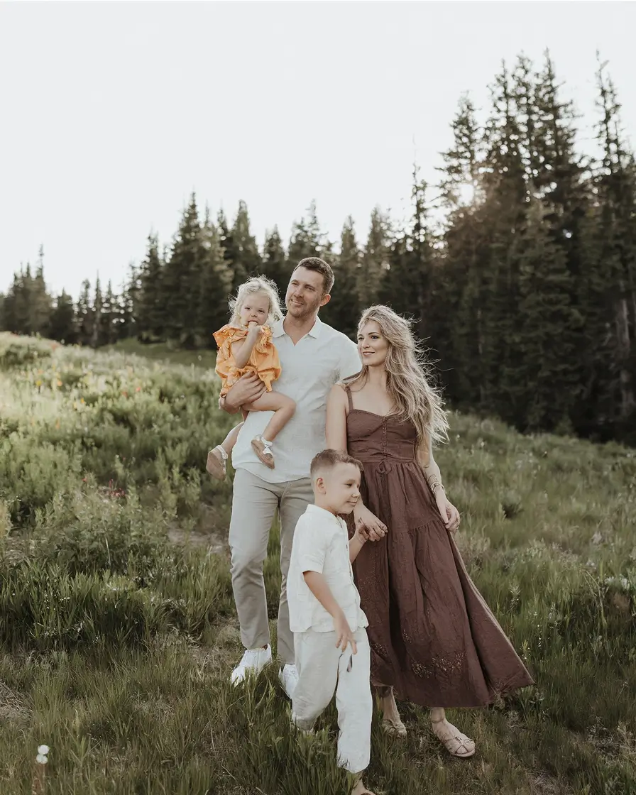 Her mom, wearing a sleek white off-the-shoulder knit dress, is soft and elegant. She is laughing, is alive, is grasping firmly and is equal to the dad. The body language and coordination of the family talk about trust, fun and unity within the arms of nature.