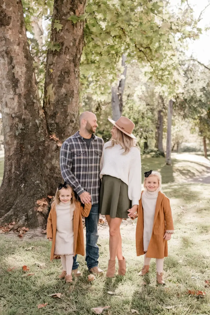 Want to elevate this even more? Add some textured tights or warm knee high socks to the children. It would also be easy to transpose to family photo outfits fall plus size by changing the balance of sweater-skirt with a mid-length shift dress and tall boots.