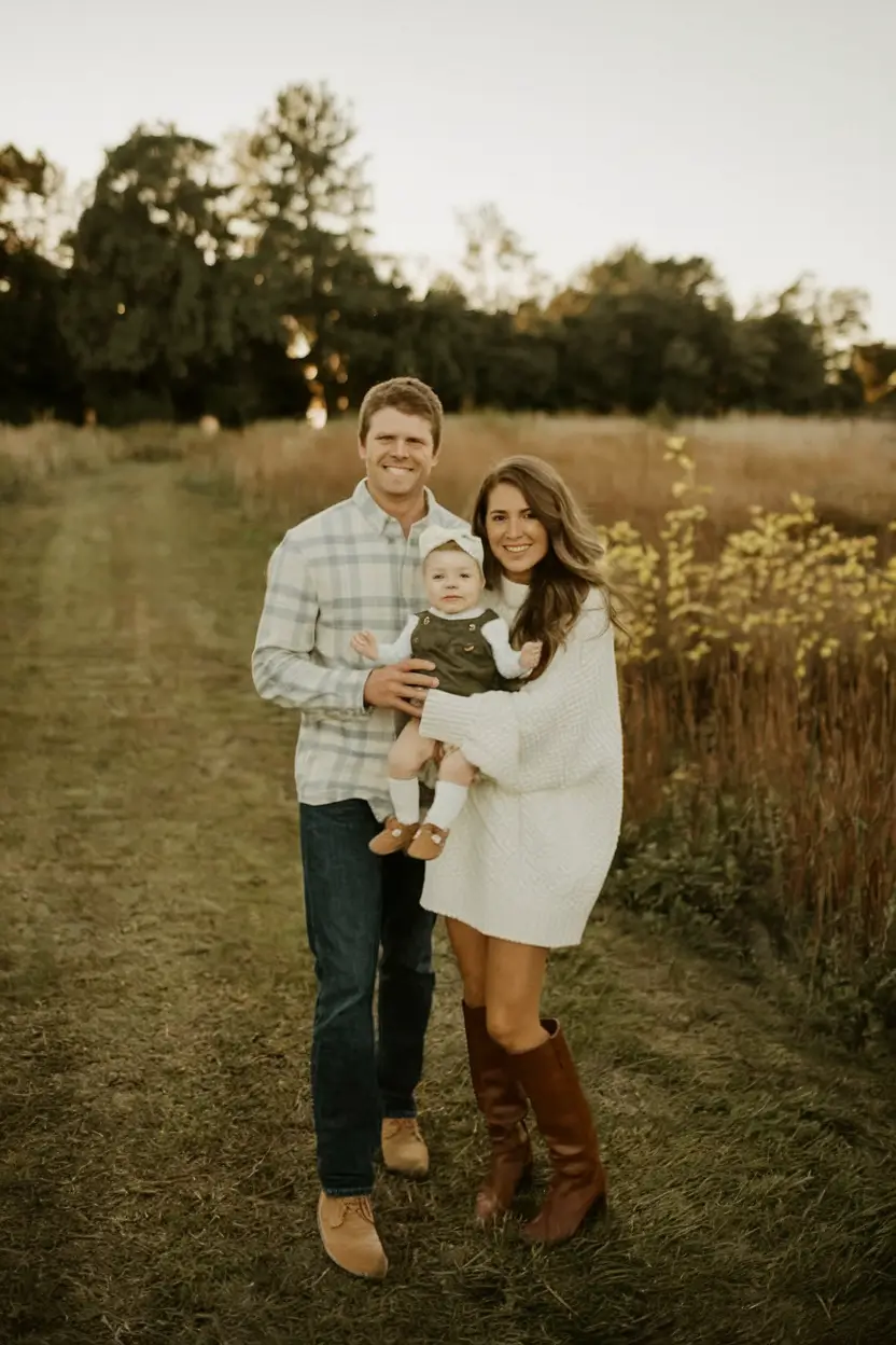 The father is dressed in a light-colored plaid shirt and a pair of jeans, and mom in an oversized white sweater and knee-high leather boots adds a stylish order to a gentle field scene. The toddler’s olive corduroy romper pops just enough without feeling loud. It is comfort, but of a higher kind and quite achievable.
