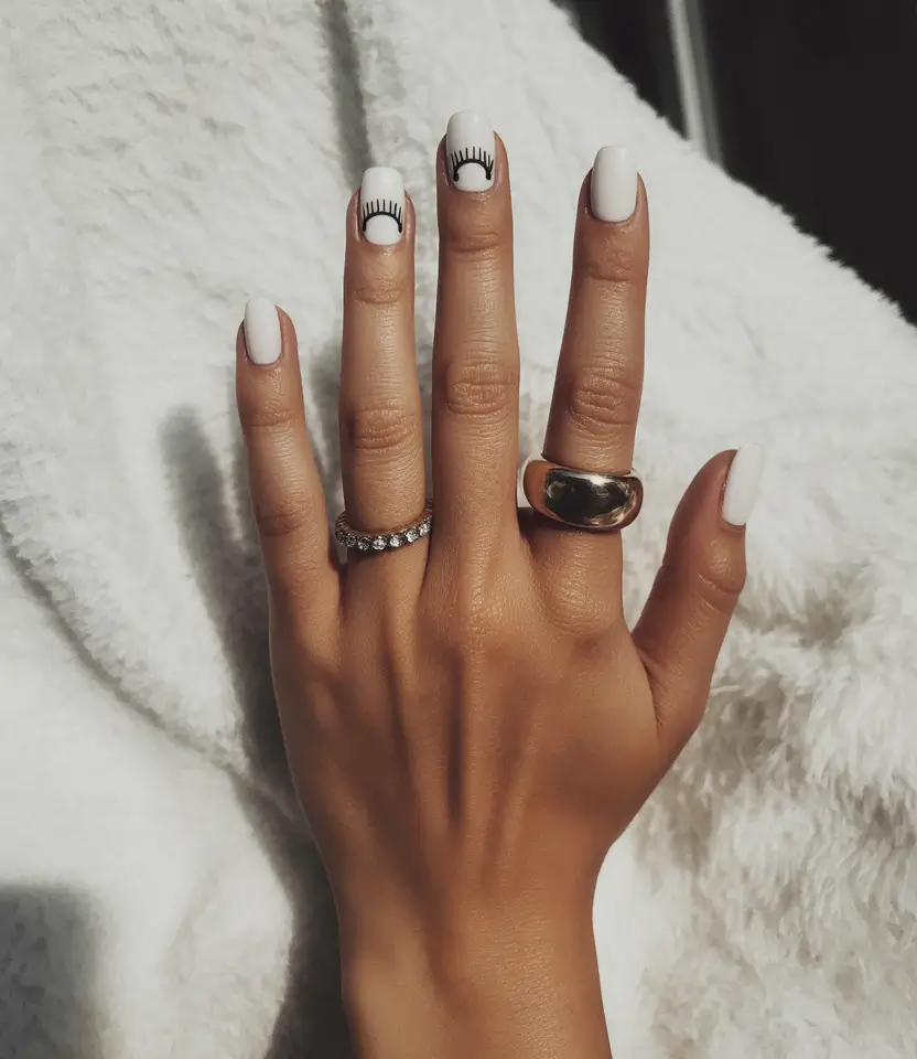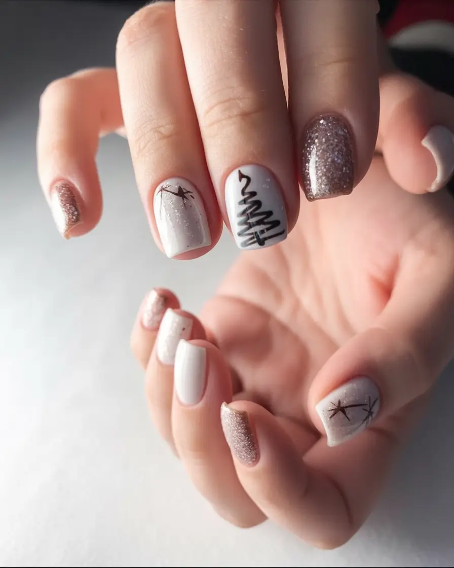 This design summarizes all that I love about winter minimalism white polish, light shimmer, and thin black line art that is graphic but lighthearted. The fine tree motif and starburst decorate call to mind the Scandinavian interiors: the straight edges, organic color and silent coziness. It is contemporary, meditative, and falls into the relaxed high-end vibe that is shaping winter of 2025–2026 manicure trends.