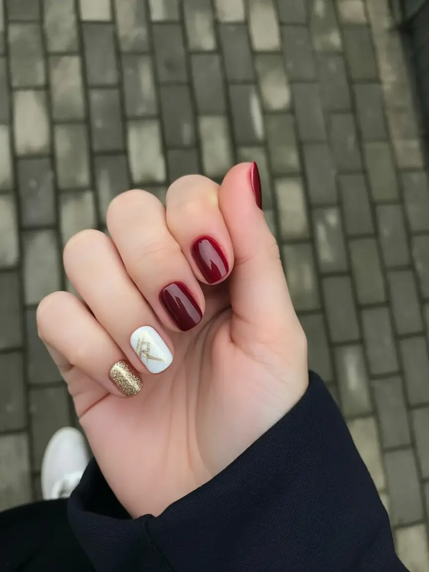 As soon as I saw this mix, I immediately associated it with Chanel Rouge Noir that legendary shade that never does not seem slightly mysterious. Essie “Forever Yummy” is the best choice to a shiny finish and the golden shade can be applied using Sally Hansen “Golden-I.” I adore the texture contrasts here, the creamy red, the soft gloss of the gold and the cold, icy white. They both make a fine balance that is highly winter manicure trend.