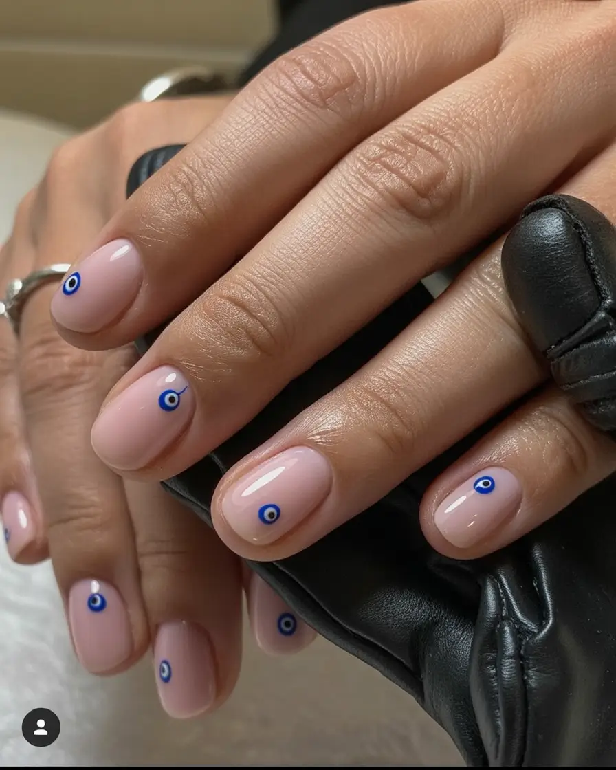 This appearance is magical pure nude polish scattered with small dots of cobalt blue, which appear as amulets. It is mysterious, fashionable, and it seems to be a personal charm. It is also one of the most distinctive manicure trends in winter that combines style with meaning, and they are intentional beauty.