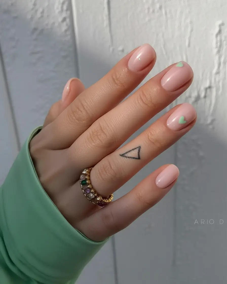 This is a heart melter, literally. The best combination of cute and sophisticated is soft nude nails with minute mint-green hearts at the ends. It is not childish and, at the same time, it is not dull. It is also, to me, a love letter to one of the simplest things, and it may be a dreamy addition to the modern manicure trends that are leaning towards the less noise, more charm side.