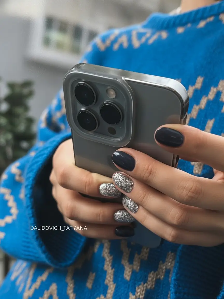 Deep navy and glitter silver – that is the nail version of the night sky with all stars in it. I was hooked on this appearance at one of the dinner parties in December, when my friend had gilded nails than gilded jewelry. It is gung-ho, celebratory and unforgettable simultaneously.