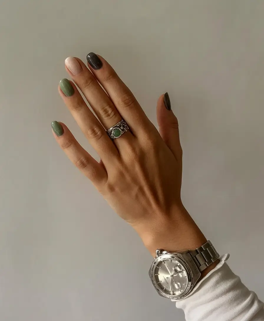 I apply OPI as a colour called Sage Simulation (which is a soft green shade) with Essie as a colour called Licorice or Zoya as a colour called dove as the darker accents. The neutral beige nail in the blend is what also makes it grounded and easily wearable on any occasion. It is slightly old fashioned, slightly new-fangled – quite like wearing woolen pants and silver jewelry at the same time.