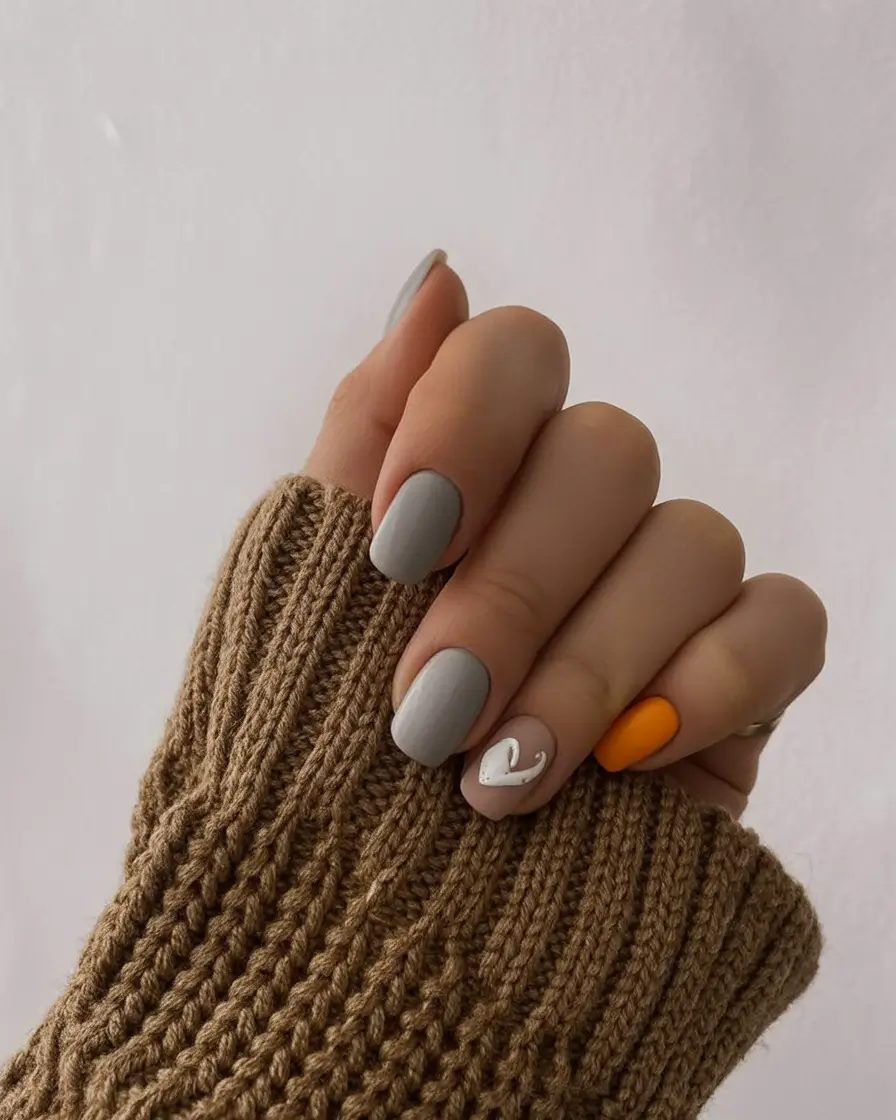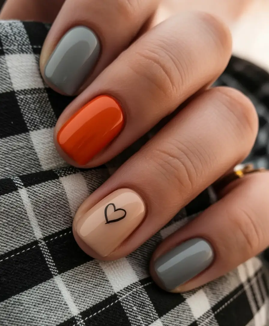 Gray, beige and tangerine- this combination may seem strange to imagine, yet the combination offers a modern and soft manicure. The small black heart on the naked bottom is what makes it unforgettable — small, intimate, and warm.