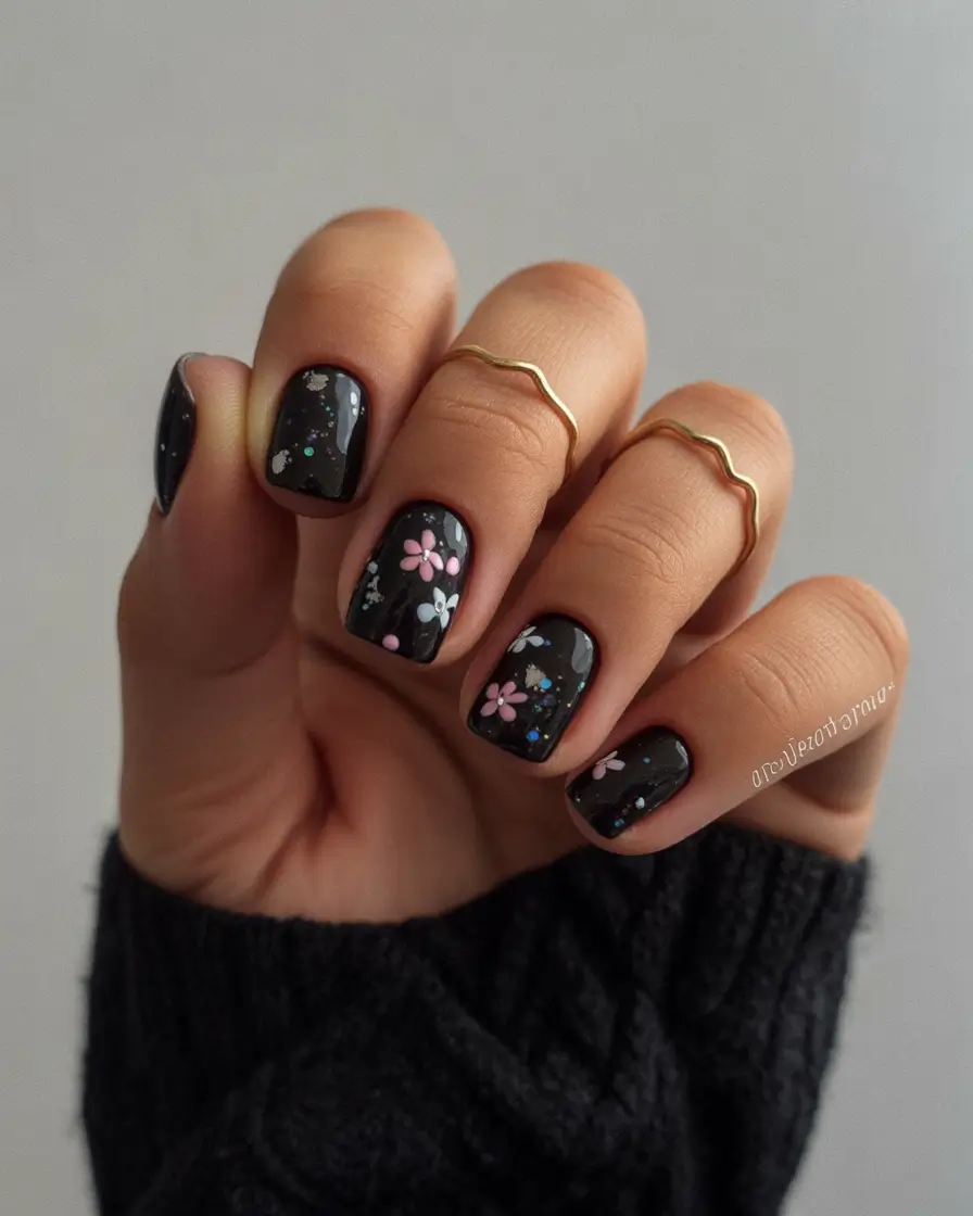 In order to reproduce it, I take OPI Black Onyx and apply tiny petals with pastel gel colors by a fine brush/dotting tool. It is a matter of balance, one of the nails should remain bare.