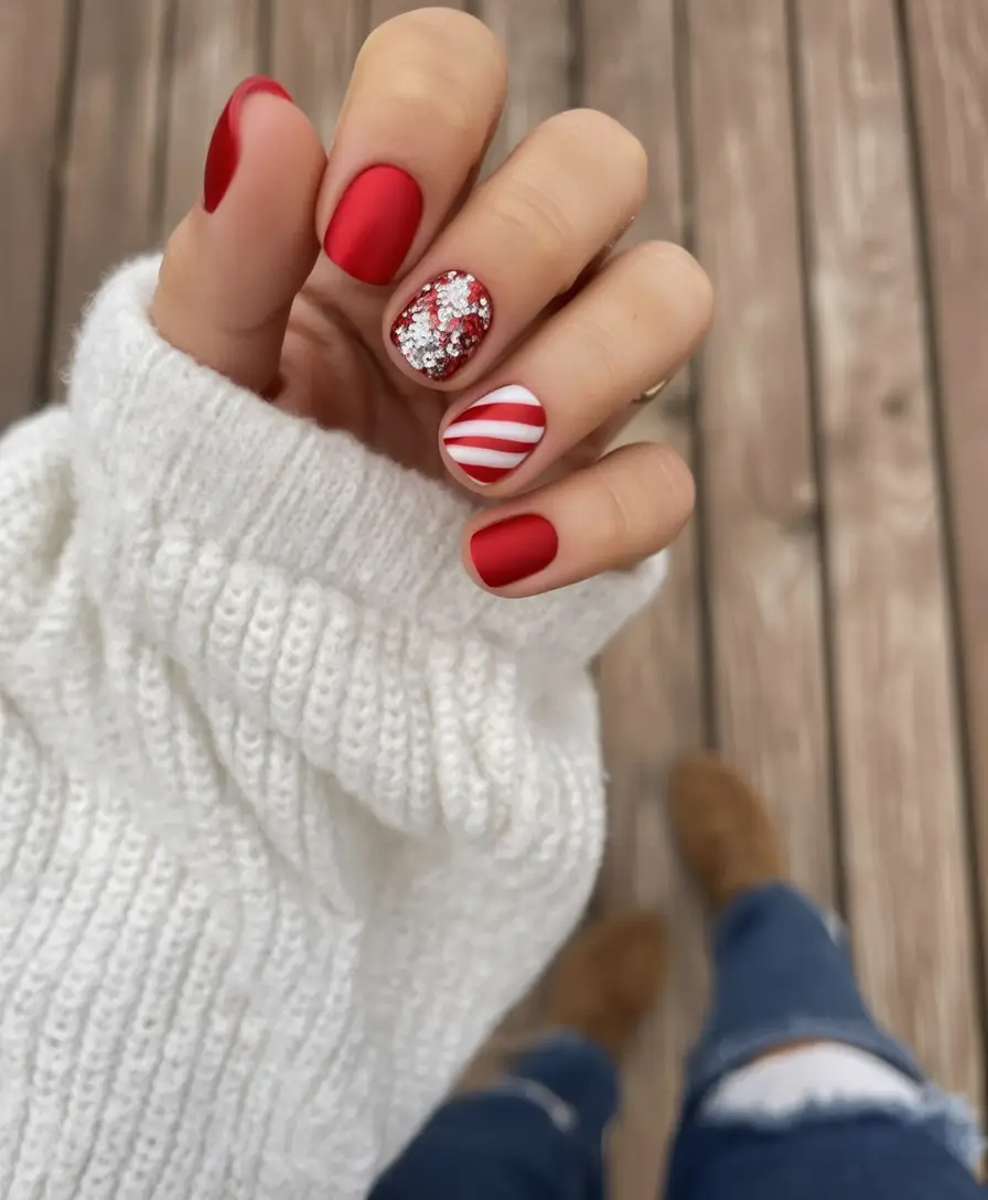Were there a method of encasing the happiness of December mornings, it would appear just like this one with red, matty nails that had been spiced with one strip of peppermint. It is the type of winter manicure trend that is not only nostalgic but also modern, playful, and elegant. It has a matte texture with a velvety finish and the shimmer and stripes add that unmistakably holiday cheer.