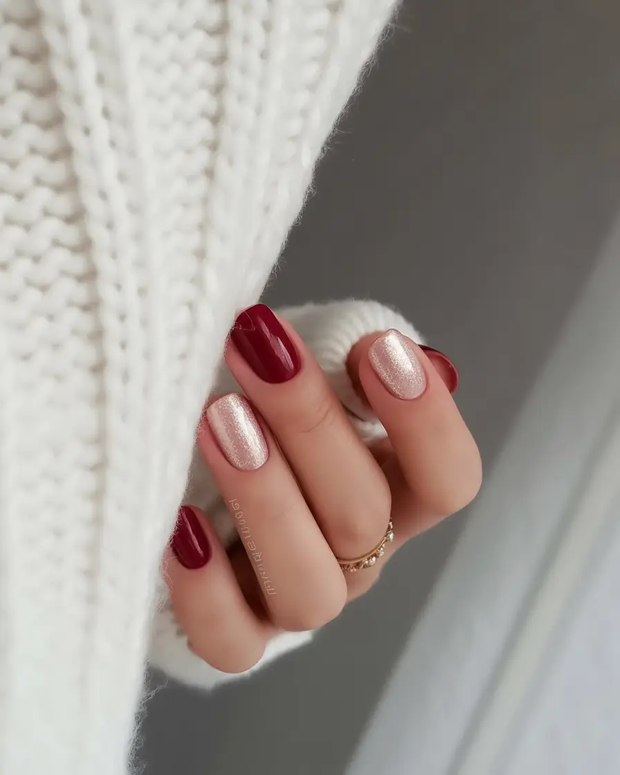 That appearance is my own description of the winter luxury deep burgundy with smooth champagne glitter. It is classy, such as red velvet and satin ribbons, and reflects all that I like about winter manicure trends: richness, contrast, and slight extravagance. It is the type of manicure that could be in either candlelight or under street lights.