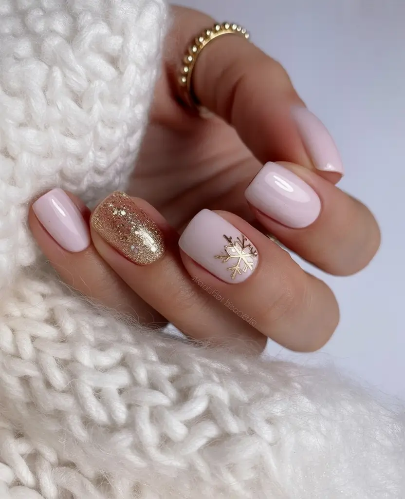 Light blush colors with gold kisses – that is how I would characterize this design. It is chilly winter romance, sensitive, ladylike, and intimate radiantness. The most impressive one is that single golden snowflake that converts a mere nude manicure into a poetic little quote. This one is easy and expensive, similar to the aesthetic cashmere throw.