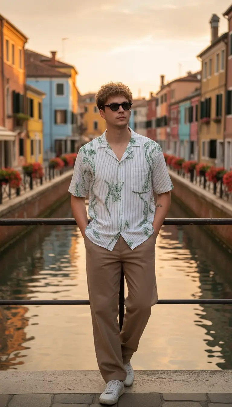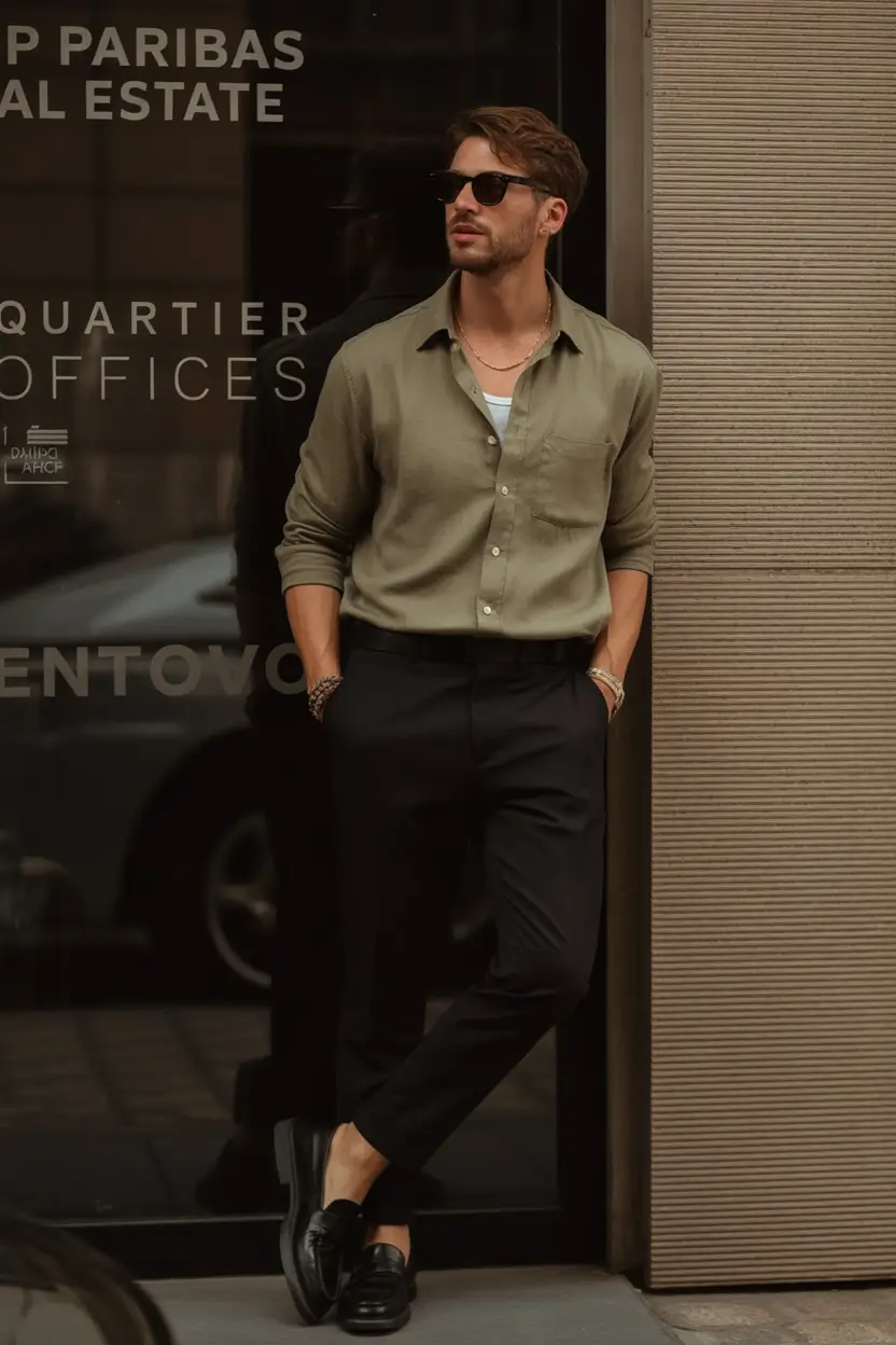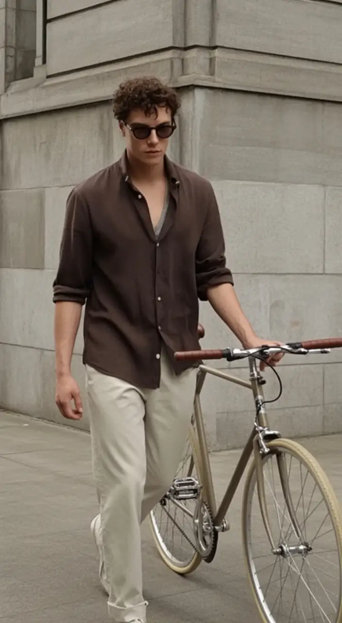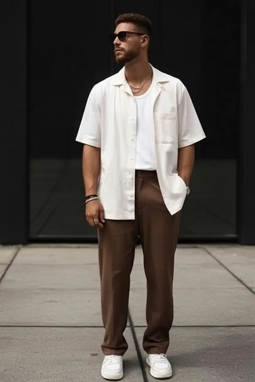 This appearance reflects that light-heartedness that every person would like to have on a long summer day – the turned sleeves, the open neck, the light flow of the material. The shirt of chocolate-brown, which is snugged into the cream trousers, is as smooth as a late afternoon espresso. It is the purest summer men outfit inspiration: casual, self-assured, and yet sharp enough to get people’s attention at a cafe or any other casual gathering.