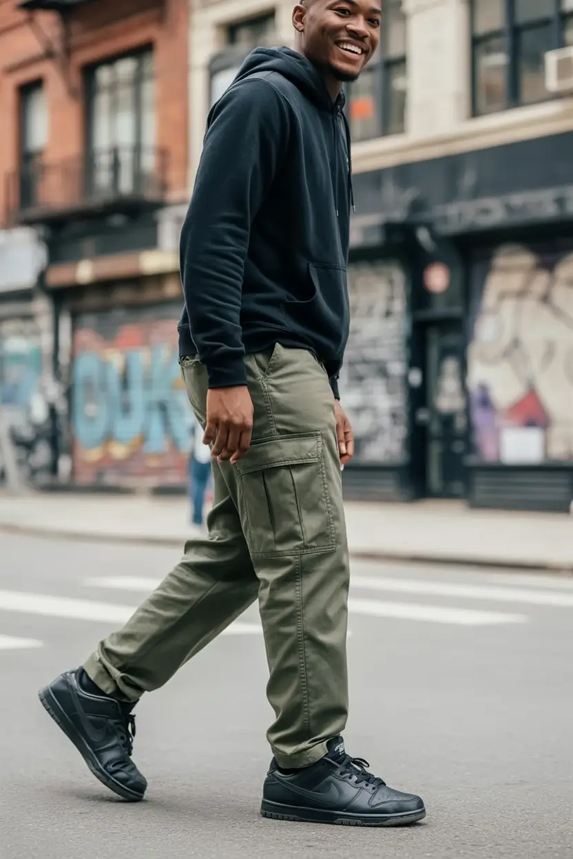 There’s a new wave in men’s outfit inspiration streetwear, and it’s not about oversized logos anymore — it’s about function, comfort, and quiet detail. This look nails that evolution with a black hoodie, olive cargo pants, and all-black sneakers. It’s practical, sleek, and made for real life.