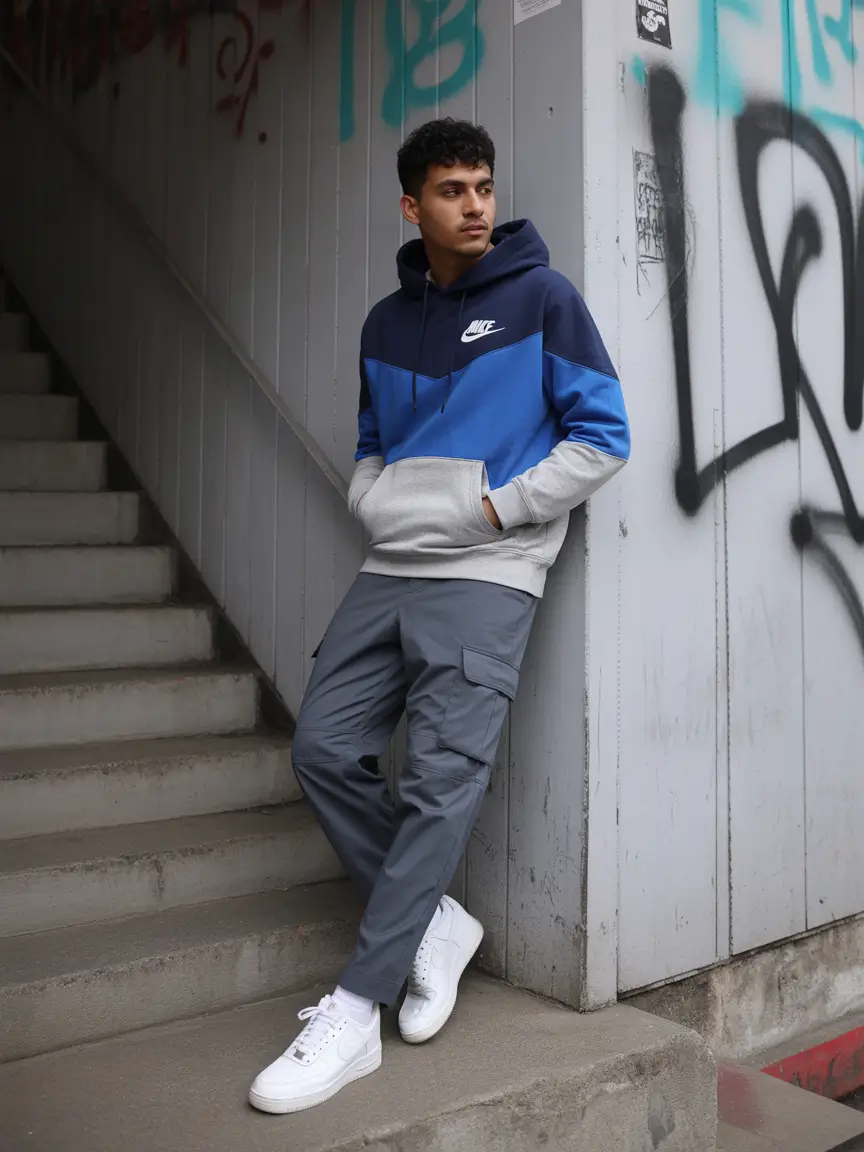 This type of styling lives on contrast. The cargos and the softness of the hoodie collide, producing an appearance of active but controlled look. The color blocked design is very energetic and the white sneakers provide that last touch of brightness. You might be wearing it in any place, you might be walking around the city, you might be hanging out on the weekend, or you might be at some informal creative gathering.