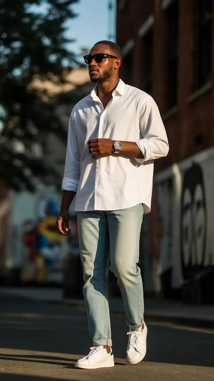 There is nothing that is more classic than a white shirt and jeans, it is the type of outfit that never lets you down. The secret is all in the fit. The appearance of this is full of quiet sophistication and would be ideal in the clothing inspiration of men in summer when there is a need to be cool, yet still look purposeful. The denim is a soft light-wash that is casual and the shirt is crisp to add some highs.