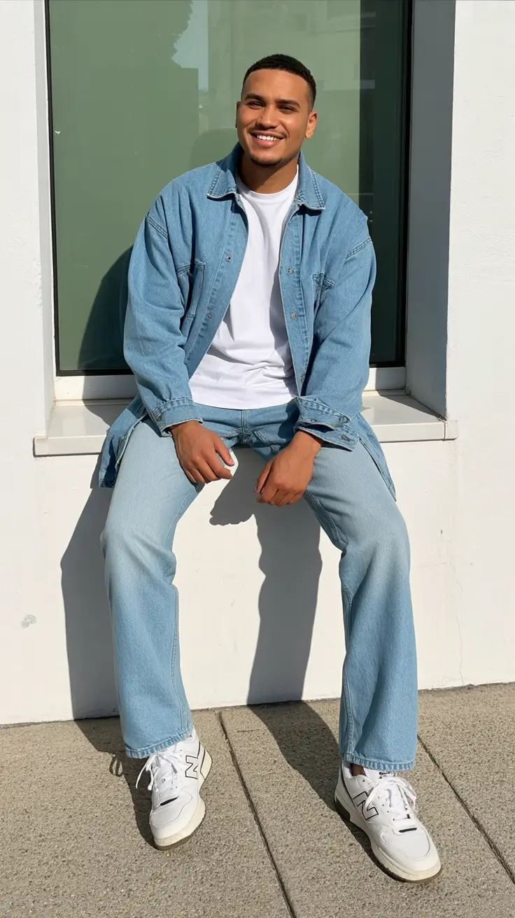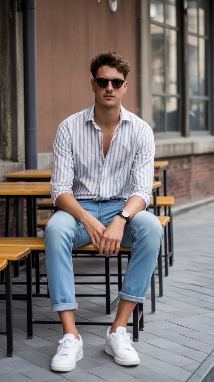 When I wear a look like this, I always play with proportion. The shirt should feel slightly oversized, the jeans structured but not stiff. White sneakers complete the outfit, grounding it in modernity. The monochrome palette of blues and whites creates that effortless balance — approachable, but curated. Think of it as men’s outfit inspiration spring, redefined for the minimalists who still love a classic.