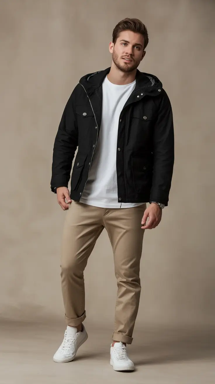 Black and beige never go out of vogue, there is a reason as to why they provide an immediate sense of balance. This outfit combines a clean white T-shirt with custom-made beige pants and a structured black jacket to produce a smooth and grounded yet sophisticated fall outfit inspiration among men. The tones are warm and neutral and can be mixed in any number of combinations.