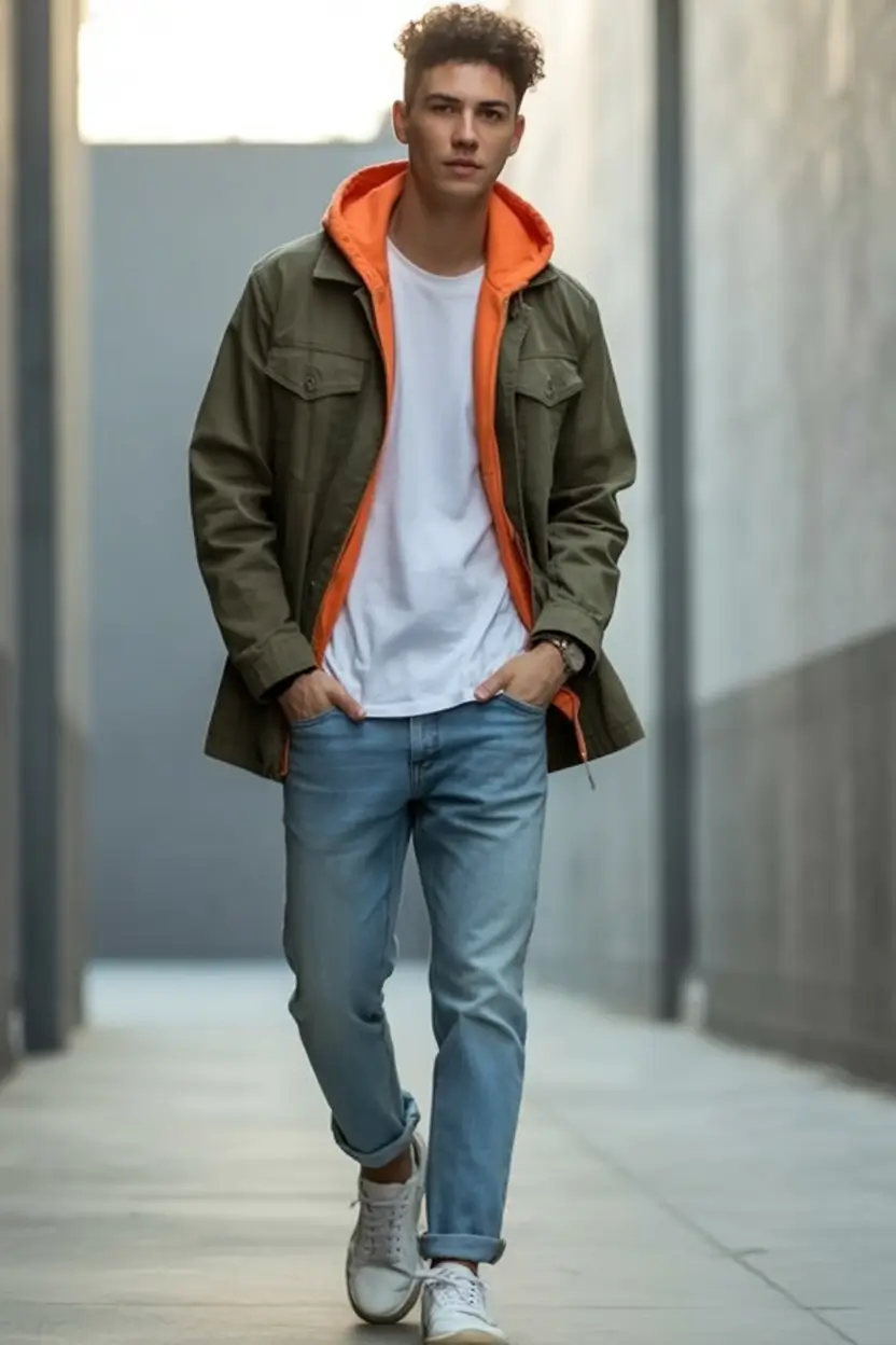 The magic is in the logic of layers: to make it warm and personal, the bright hoodie is selected, and to make it organized, the jacket in the form of military clothing is selected. The appearance is a combination of street and usefulness as it is paired with faded jeans and clean sneakers. It is not theatrical without becoming dull.