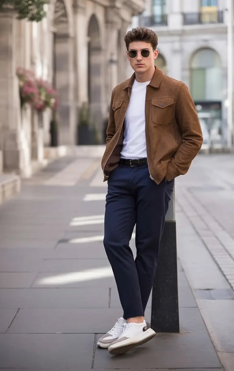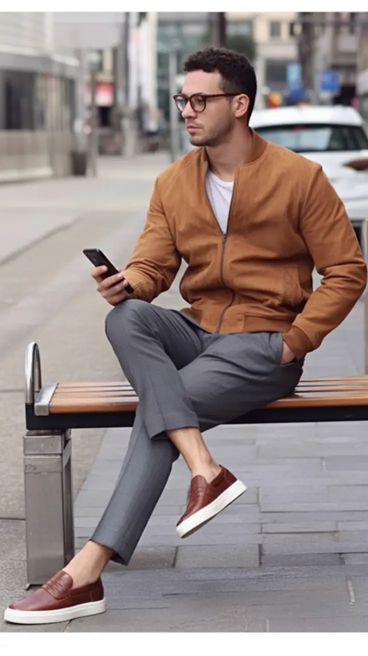 A caramel suede bomber with custom gray pants – that is the way to dress when you are not trying too hard to look good. The blend is in the middle between the informal and elegant, and it is the type of a men outfit that inspires fall that is easy to wear during the days and nights out. The bomber is warm and well-structured, the lean trousers make things clean and tidy.