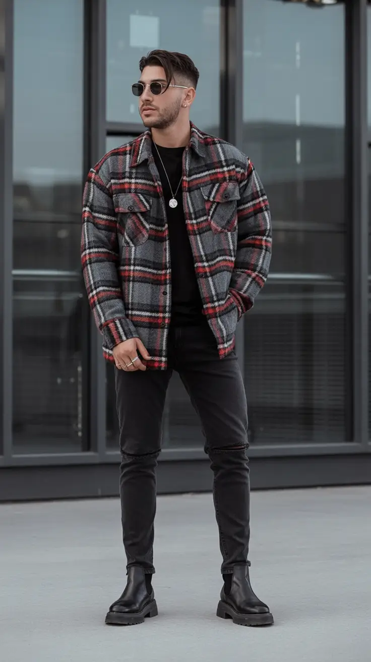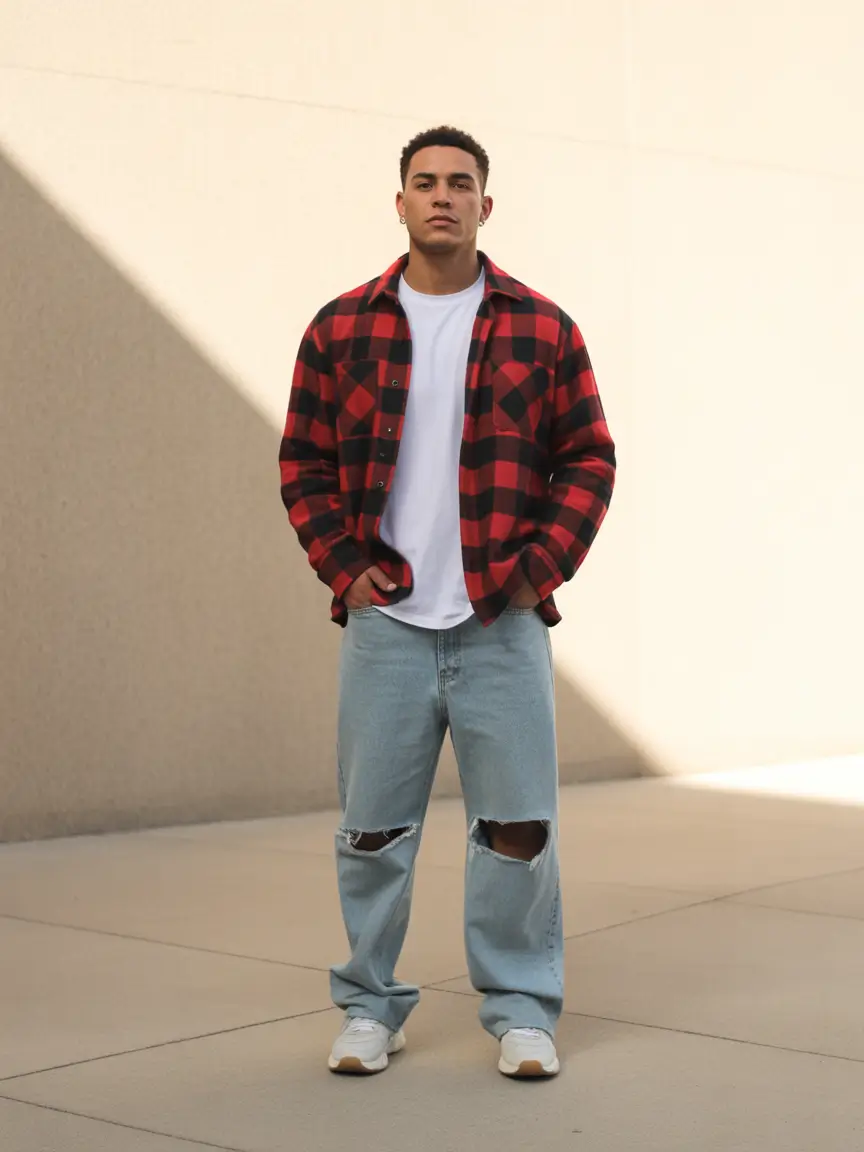 Here’s a look that carries serious attitude — the kind that feels borrowed from ‘90s Seattle but filtered through 2026 sophistication. A red and black flannel shirt over a crisp white tee, paired with distressed denim, is the ultimate men’s outfit inspiration streetwear combination. It’s relaxed yet intentional, bold without shouting.