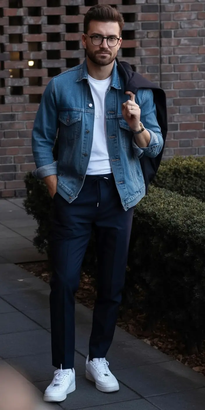 In the event that there is one piece that men wear and that can be described as the source of inspiration on their casual outfits in 2026, it’s this one, a standard denim jacket topped with a white shirt, a pair of navy pants, and a clean pair of sneakers. It is the city uniform of all times: smooth and friendly. The bustled pants provide some shape and the fitted jeans take the appearance past plain jeans.
