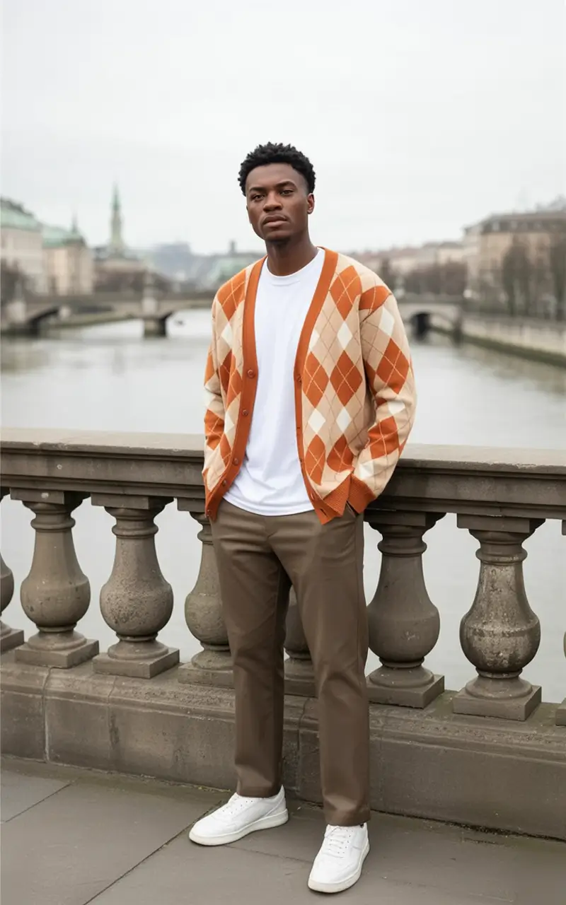 Cardigans are back in business, and it is this one that justifies it. The orange-and-cream pattern of warm and geometric design delivers a vintage flow of energy but maintains the fit contemporary. Combined with tan chinos and white sneakers, it is fresh and positive it is a genuine men outfit inspiration spring moment.