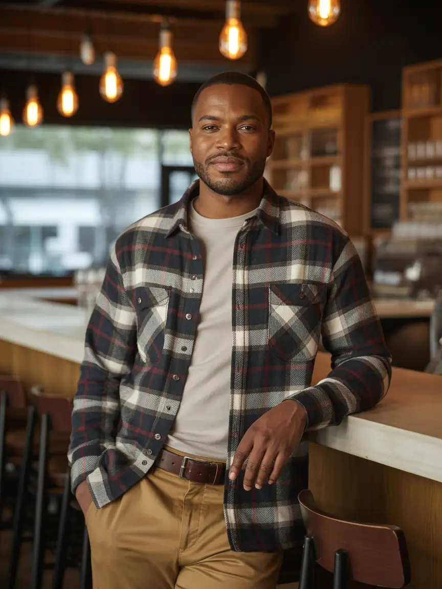 No wonder earthly neutrals are coming back to the limelight. It takes into account all that is driving the inspiration behind men in outfits in 2026: comfort, longevity, and warmth, which this combination, a dark flannel overshirt, beige chinos, and light tee, embodies. It is a silent type of style that never goes wrong.