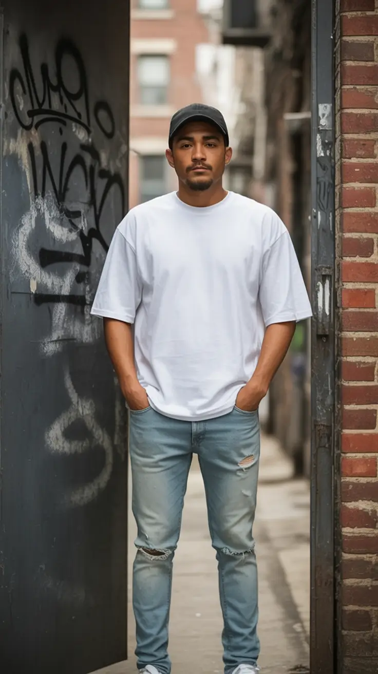 Simplicity is rightfully dressed up and on days when it is laid bare, it speaks volumes. With an oversized white tee and light-wash ripped jeans, this appearance brings the energy of the real streets, the vibe of raw, self-assured, and totally unimpeded. It is the street style of outfit inspiration of men in the entirety: clean, balanced, and attitude-driven.