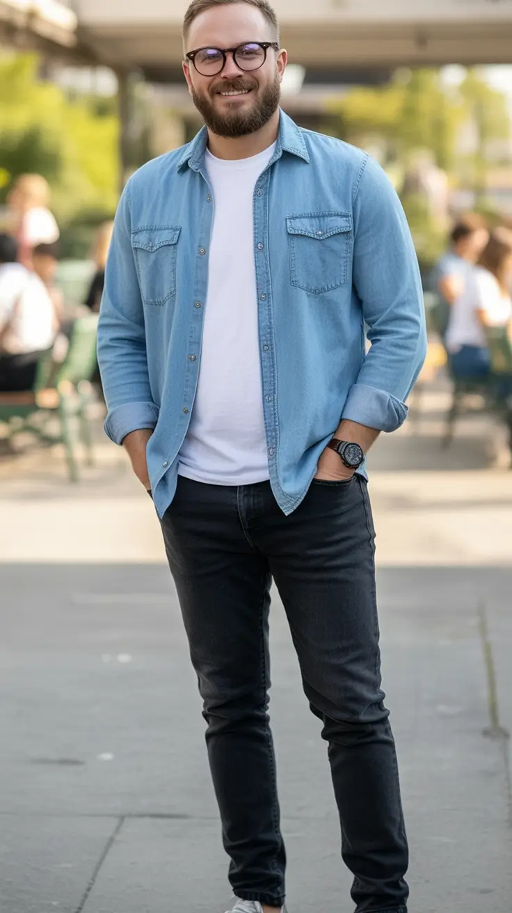 Double denim is back — but not in the over-the-top way it once was. The modern version feels lighter, cleaner, and relaxed. A pale blue denim shirt layered over a white tee and straight-leg jeans gives off a calm, confident vibe that defines 2026’s men’s casual outfit inspiration. There’s an honesty to denim — it’s dependable, familiar, and never really out of style — but here, it’s styled to feel fresh again.