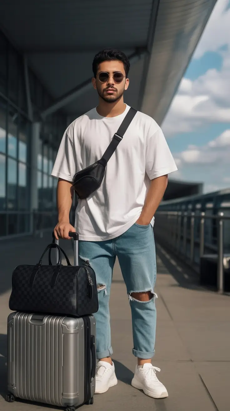 Travel style is all balance- much appearance of calmness and the ability to look cool and this outfit is perfect. An oversized white t-shirt, denim jeans with rips, and smooth white sneakers are a dreamy inspiration of a travel outfit of 2026 in men. Add a luggage and crossbody leather bag, and you are good to go around in style.