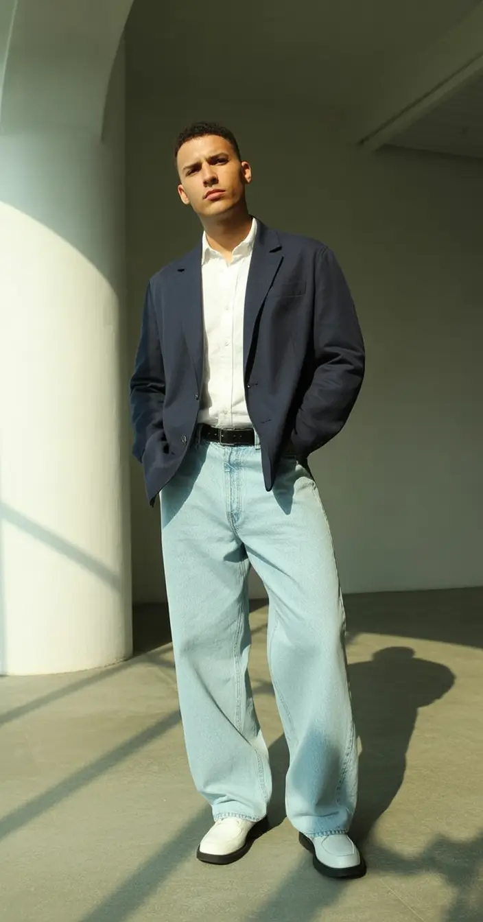 This outfit captures a perfect tension: refined up top, relaxed below. A tailored navy blazer over a white shirt paired with wide-leg light denim makes for one of the most unexpected yet satisfying combinations in modern menswear. It’s men’s outfit inspiration spring meets minimalist tailoring — clean, elegant, but distinctly current.