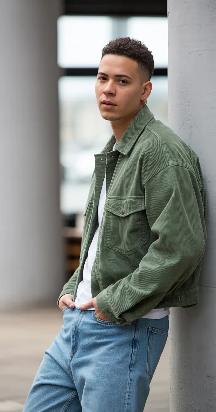 Corduroy is having a full renaissance moment, and I’m absolutely here for it. This soft green jacket paired with light-wash denim feels like nostalgia meets modern simplicity — warm, tactile, and easy on the eyes. It’s one of those men’s outfit inspirations that perfectly bridges men’s outfit inspiration fall and early winter.