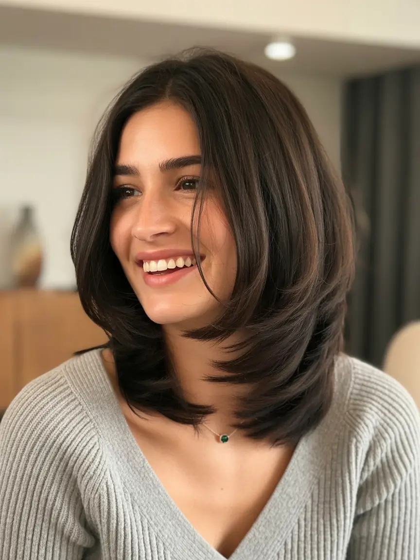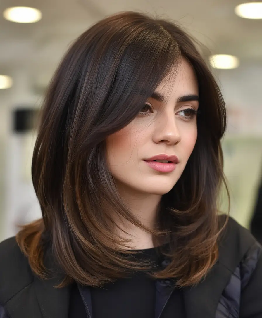 This espresso-layered cut will suit you well in case you have ever desired to be fancy yet at the same time be approachable. The satin shone of the dark and rich color is offset by the soft texture that provides depth and motion. It is smooth but not hard, it is highly polished, and even casual enough to be worn every day. The thin layering makes it dynamic and the pieces framing the face also make the overall silhouette very beautiful. It is a winter bob haircut that is equally good with a fitted blazer on as it is with an oversized scarf.