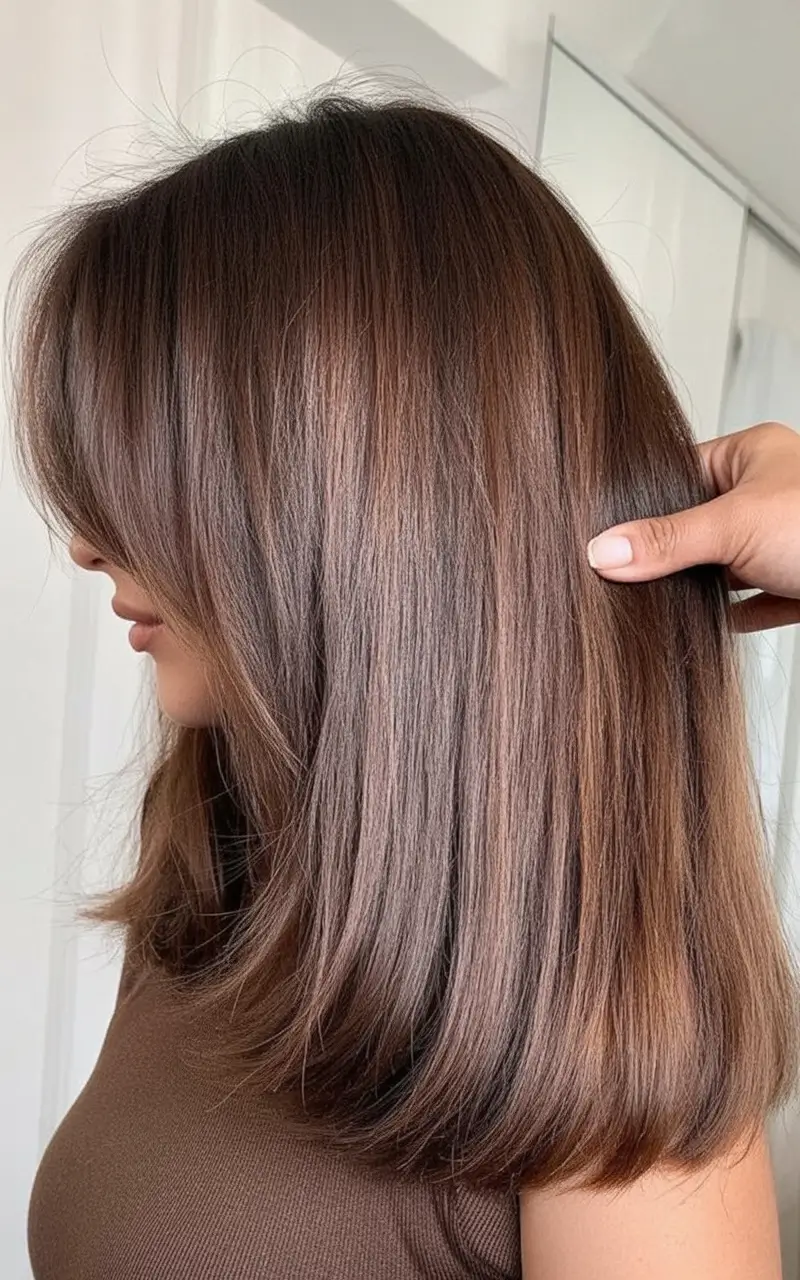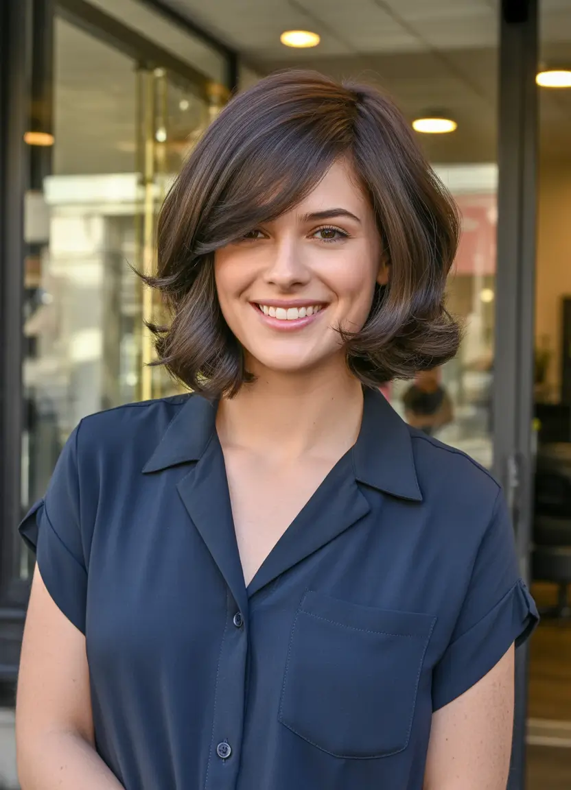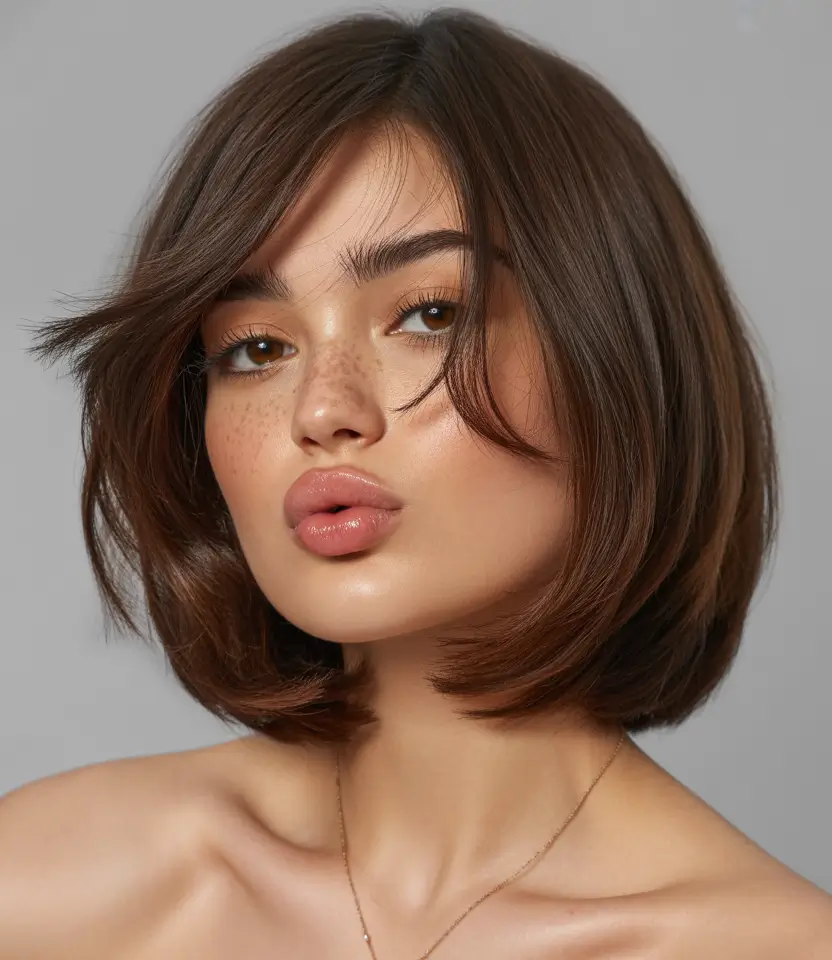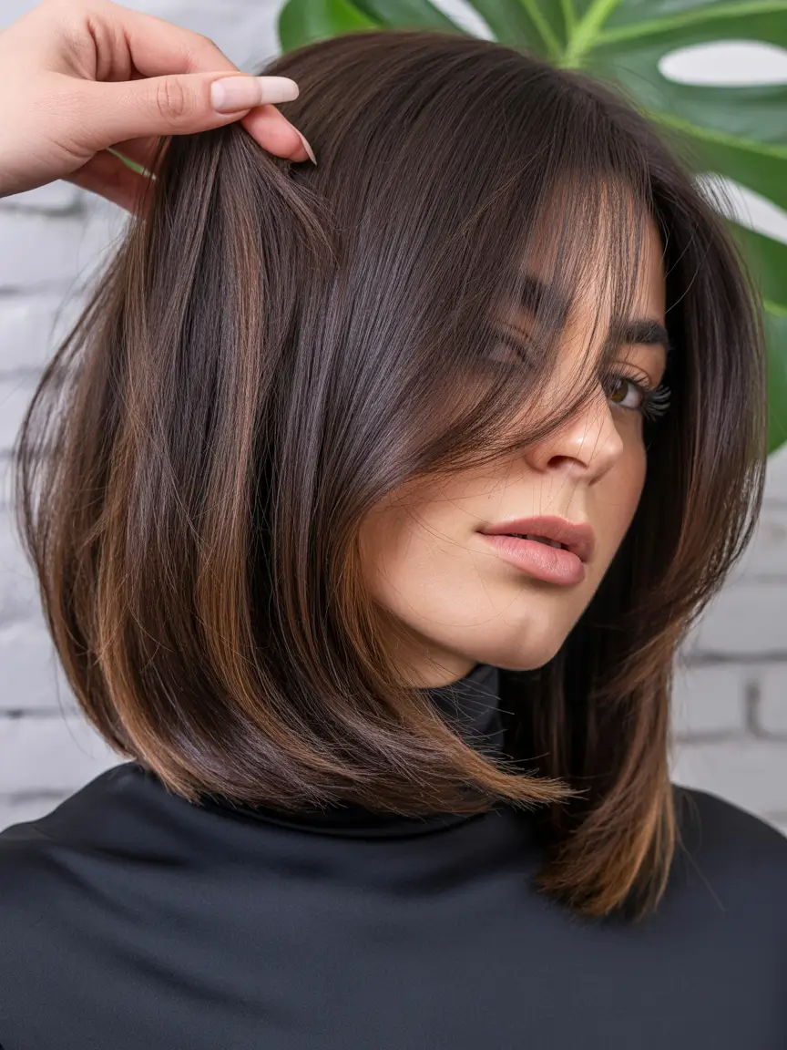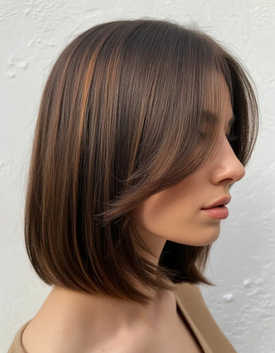 It is the coziness of this style that makes you feel as though you enter the sunlight on a cold morning that warm golden light that immediately transforms your mood. The cut is flawlessly placed at the shoulders, just the right in between length that preserves femininity of longer hair yet retains that cutting edge of the modern bob. The shade of cinnamon-brown, mixed with small ribbons of honey, splashes something liquid to the hair. It is a brown bob haircut winter favorite in that it adds color to the face, when all things out there are dull. This is a shape which walks with you, and which at the extremities is soft, and even a little stratified, giving it that natural swing without much difficulty when you put it into your coat.