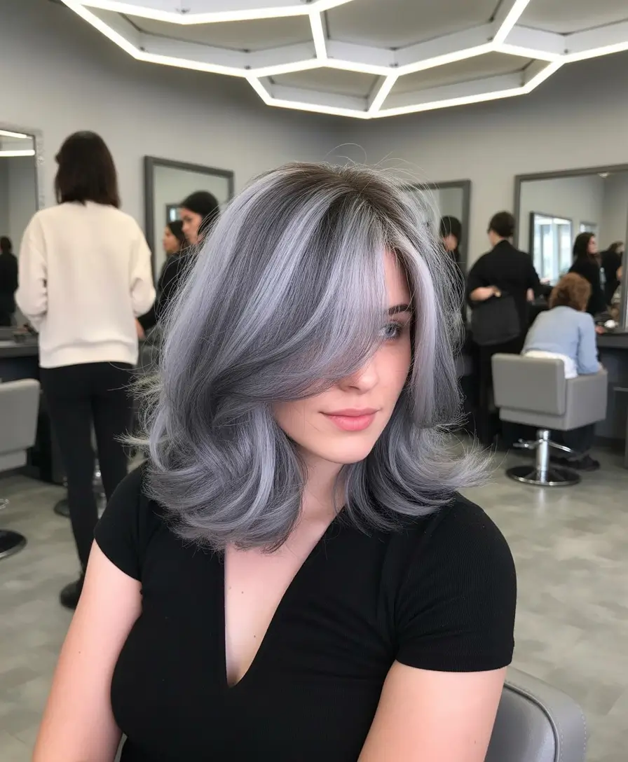 Something airy in this one–the silelly color seems to be moonlight strangled into strands. The layers are more volumetric, and they are longer, and the cool color displays all the light surrounding you. It is a daring but non-irritable winter bob hairdo aespa style futuristic yet romantic at the same time. I have always admired the feeling of such a shade, which is so powerful and delicate as fresh frost on glass. It belongs to the woman who is not afraid to possess her glow even when everything in the world is bland.