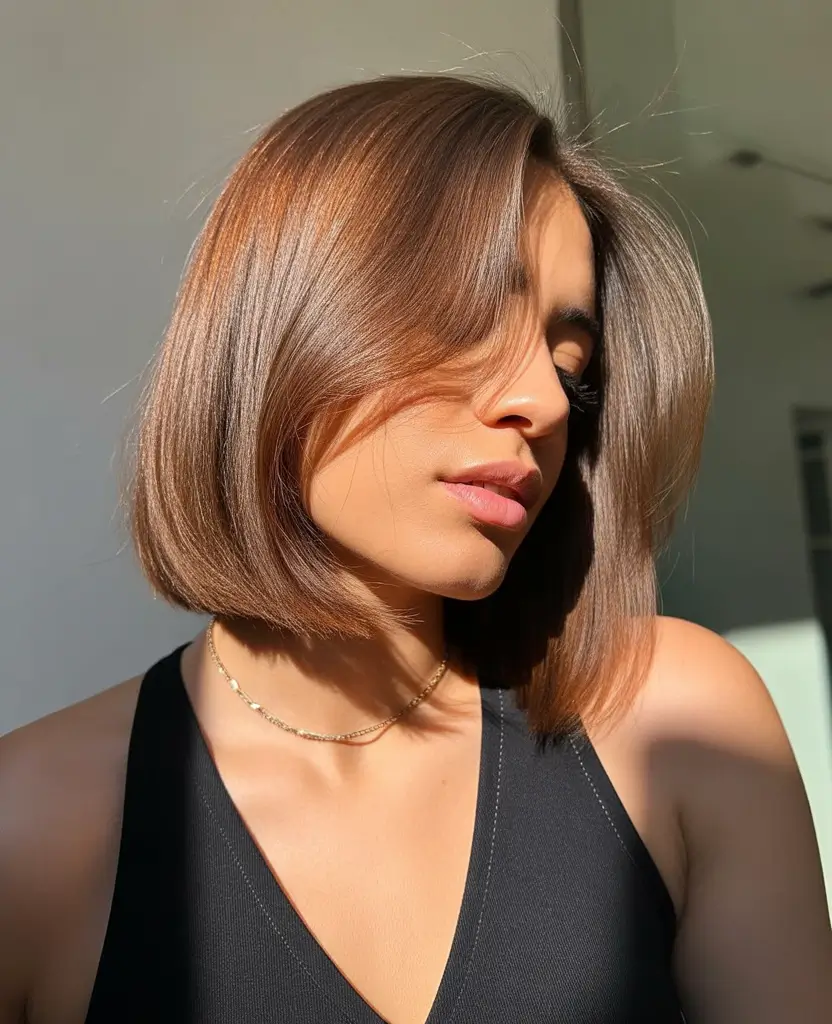 Had sunshine been permitted to wear a hair color, it would have been like this. The coppery reflections on the amber-brown base are beautiful and the ordered length immediately below the chin render it sophisticated and cozy. It is one of those winter bob hair cuts that seem to shine even in such world when everything turns in black and white. The front sweep is soft and this makes it romantic enough to enjoy during cold mornings in winter.