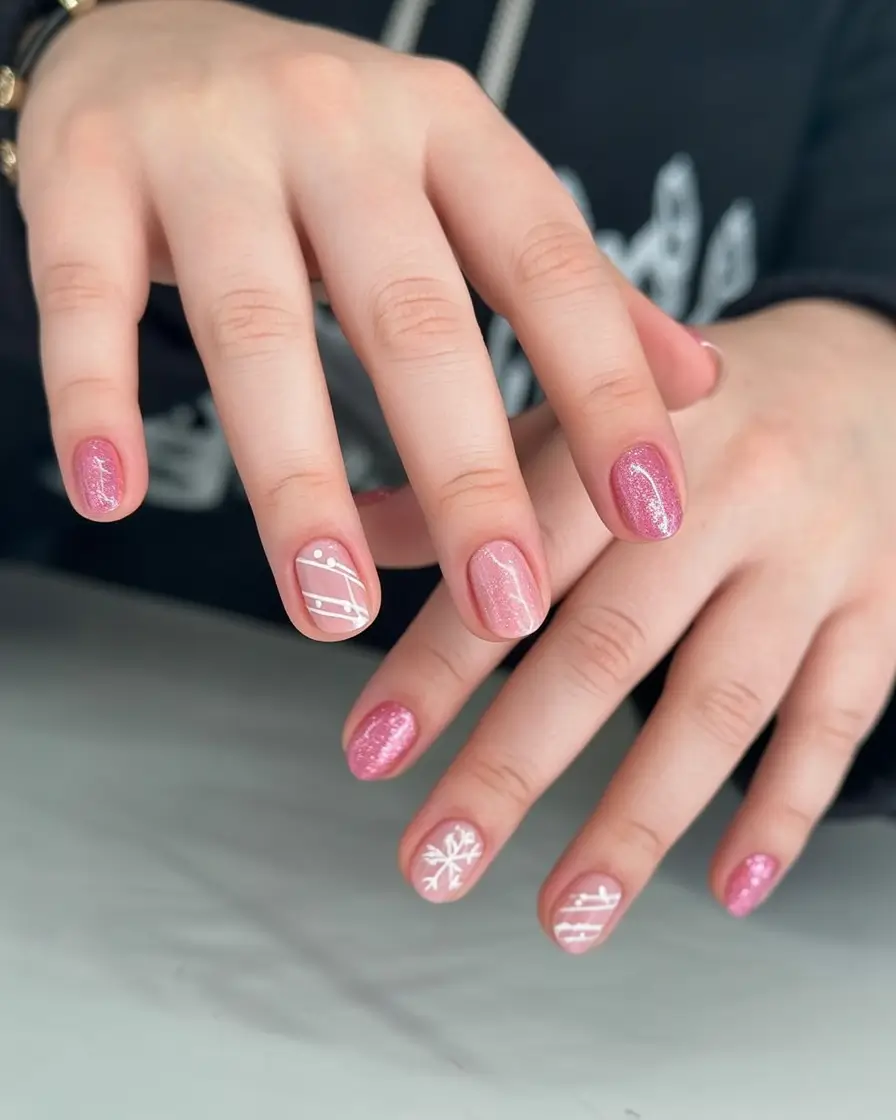 Soft pink shimmer-kiss and tender white detailing on the nails is timeless. The snowflake designs and fineness of lines ensure that this appearance is not only more festive but also wearable, a nice mix between short nails of pink winter and something quietly making a statement. It’s sweet, but not too sweet. Even a small glitter can make it feel like it is moving and just enough glitter can be used to make your hands appear as having been polished without much effort.