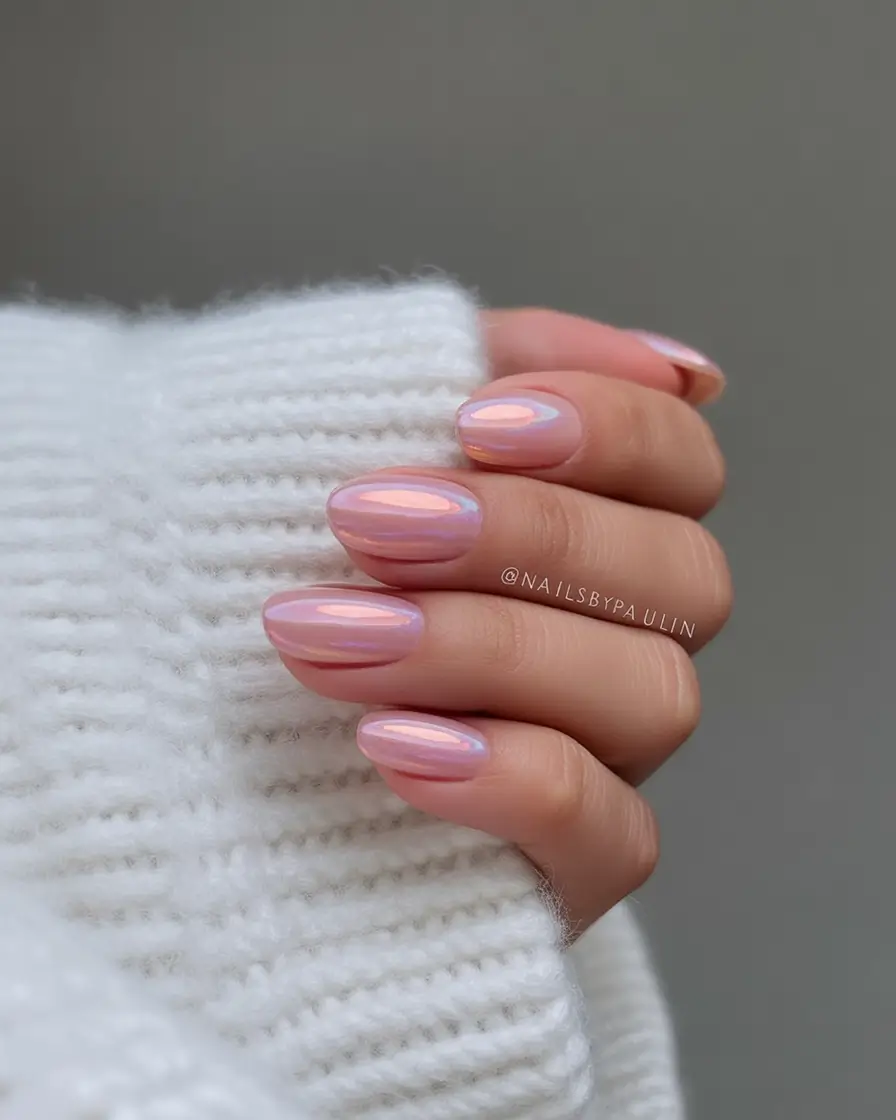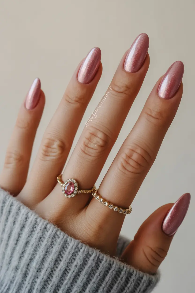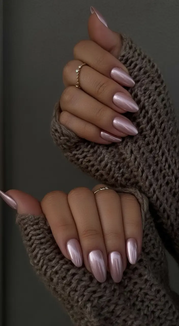 The sensation of this manicure is of fresh morning light against new snow. The shimmery shell-pink polish captures any trace of movement, alternating between blush and champagne — an undeniably magical twist on pink winter nails almond. Its rounded and short cut is enough to make it easy to wear in everyday life, and the pearly glow can be treated as slightly luxurious. It is classy, but cozy, as a cup of cocoa in a cashmere sweater.