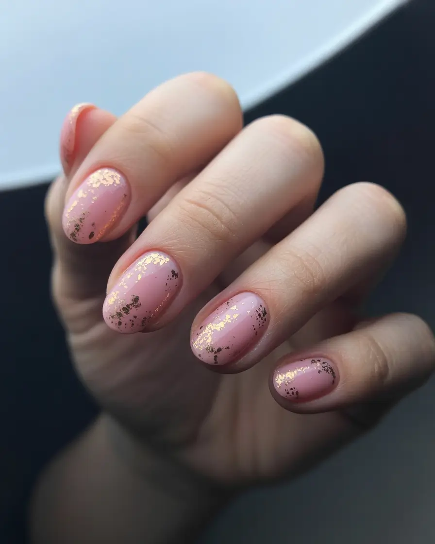It is a soft gold sunrise manicure. The just pink base with irregular gold foil details is modern and classy, the nature of the pink nails in winter that are as simple to do as they look wonderful, beautiful at brunch and at a winter party. It has a depth–the openness of the pink makes the metallic flecks not so overwhelming to the appearance.