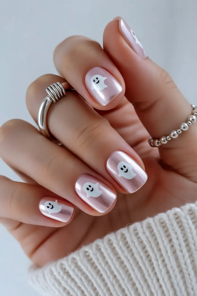 This design is the happiness of manicure in a pure joy form; soft pink chrome nails with cute white ghosts. It is cute but refined, so it becomes an unusual choice of pink winter nails short lovers who need a change of custom patterns. The chrome effect is provided which gives it a frosty look and the small ghosts provide character and humor to it- evidence that winter style can be fun.
