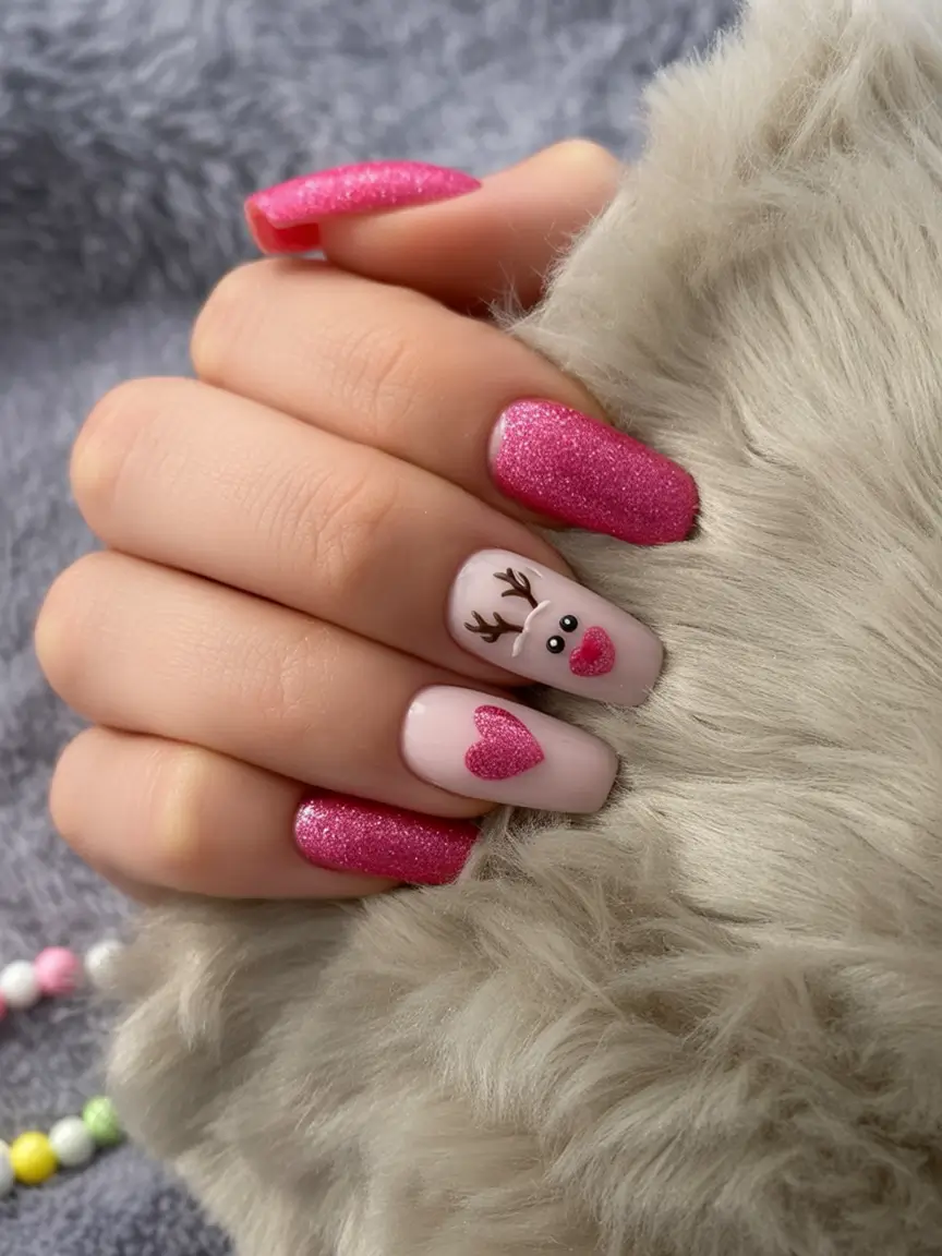 There is no winter magic like this manicure, the hot-pink glittery nails combined with a cute reindeer and a heart. It is celebratory but not too much so, and just adds the right amount of lightheartedness to pink winter nail designs. The texture comparison matte glitter and creamy surface also provides depth aesthetics, which is almost comfortable to observe.