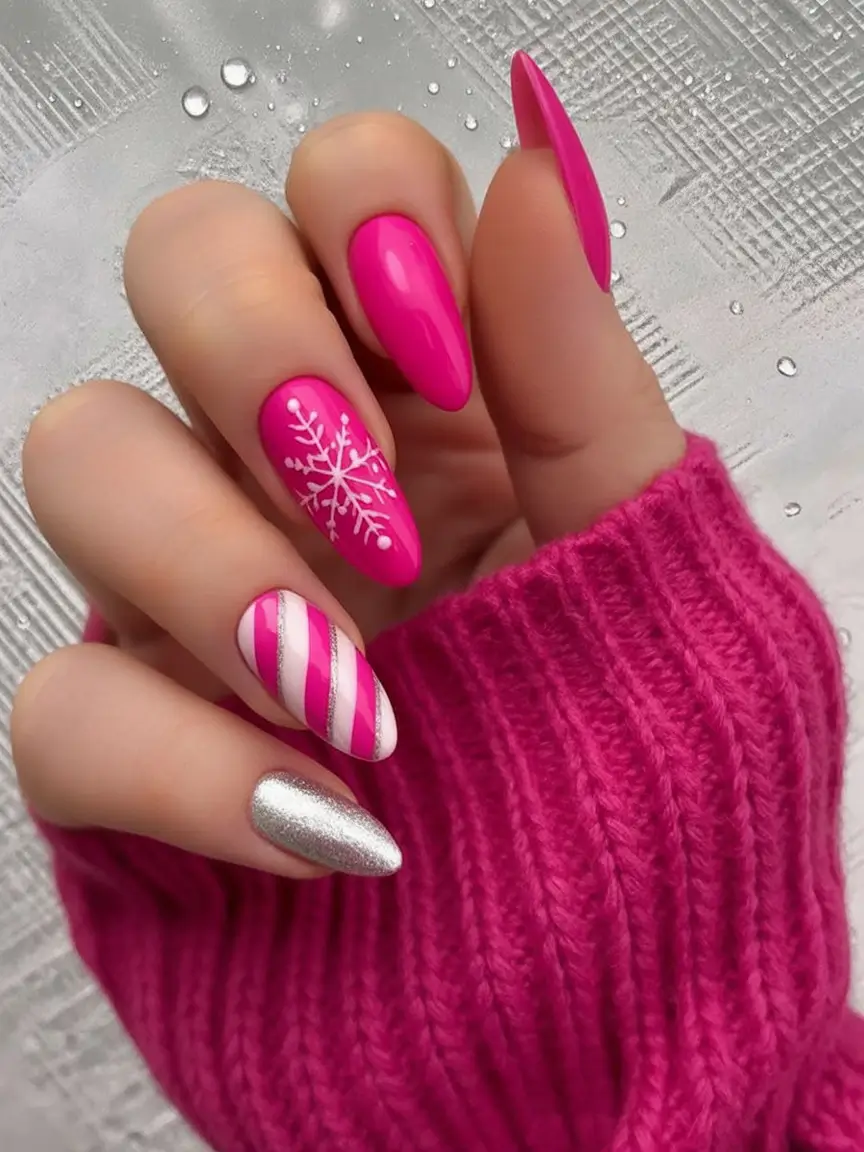 This design is a combination of all that we enjoy during winter – bright pinks, silver accents and fun candy-cane stripes. It is a great idea to have perfect pink winter nails almond lovers will wear it, it is bold, but balanced, and festive. The detail of the snowflake on one nail creates its magic final touch such as the shimmering of snow in the sun.