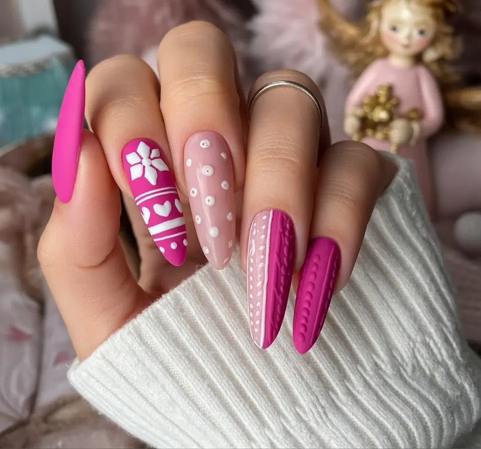 Cushy, plush and so welcoming – a design that is reminiscent of your favorite winter sweater. It is one of the most creative versions of pink winter nails this month by combining matte pinks, glossy nudes, and knitty-knitty detailing. The texturization is done in 3D providing a sense of coziness to any user who admires a touch of creativity in his/her nail polish.