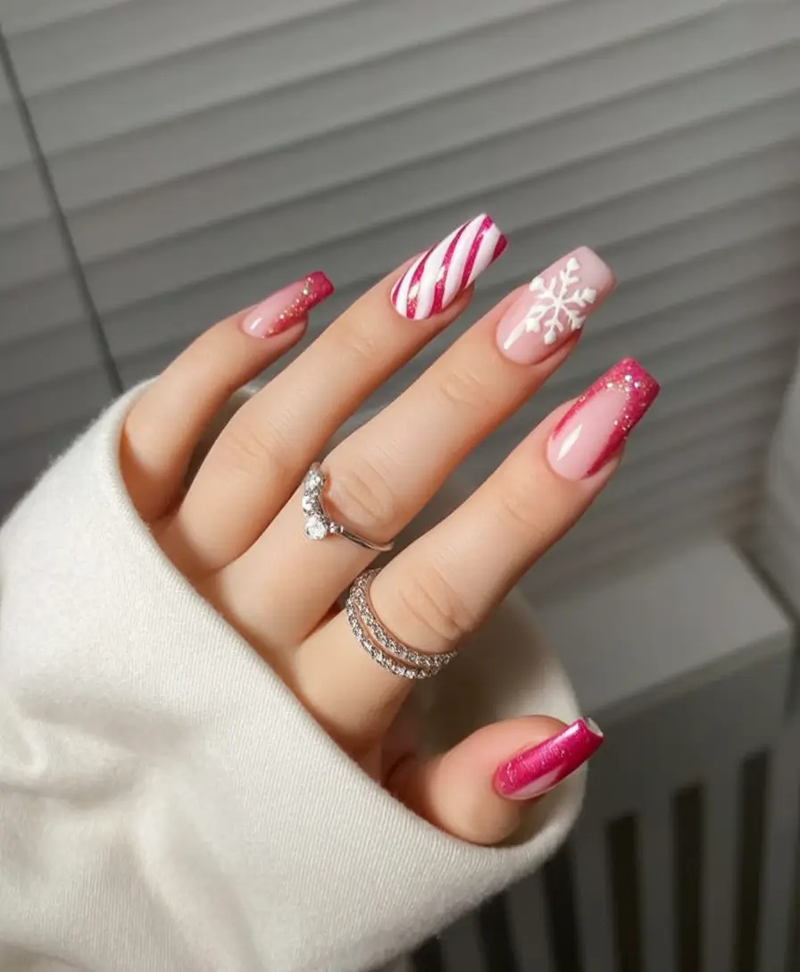 Delicate but sophisticated, this design is directly based on peppermint candy and snow sparkle. Switching between candy stripes and pink glitter gradients, it is the best option with a pink winter nails square or longer. It is playful and glam at the same time – perfect during holiday parties, or even around the fire.