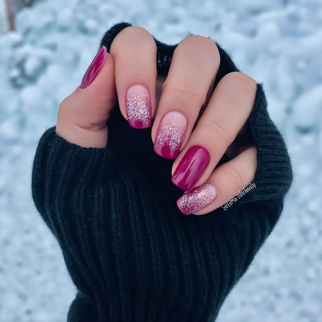 Dark berry colors fade to a glitter ombré softness – this is the look of elegance in the season. It is sexy, self-assured, and classy, and it is placed well between the pink winter nails glitter and the high-class minimalist design. It is the epitome of a cold-weather chic and it is perfect to wear at work and at celebration.