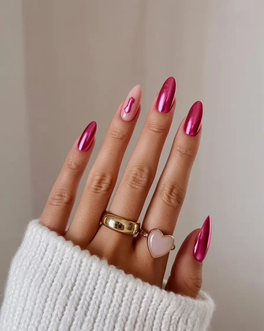 This is it–oh, it is power in pink. This smooth rose-chrome surface is molten metal immersed in style. It is ideal when you are a pink winter nails almond and you do not have to have glitter on your nails. Still on, chrome manicures are massive this season, and in pink tones, they are surprisingly warm, as the winter sunlight.