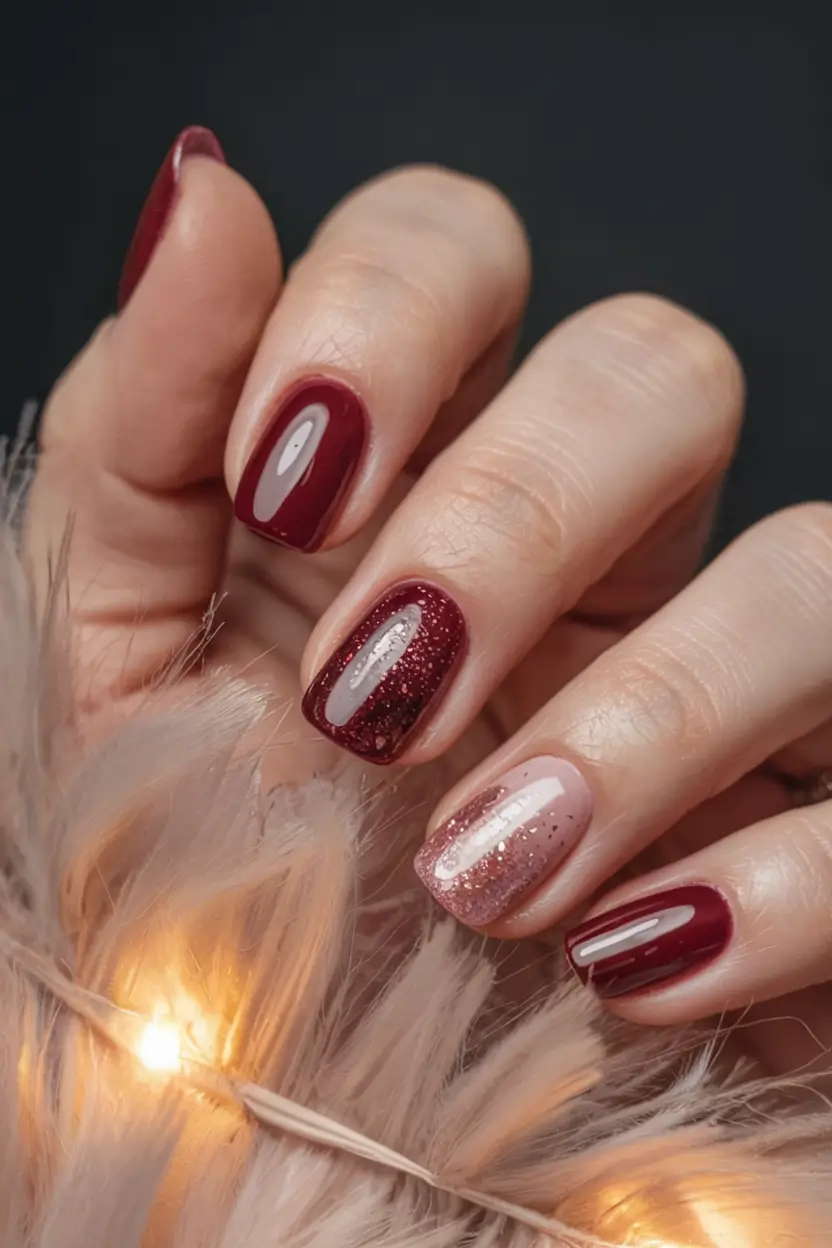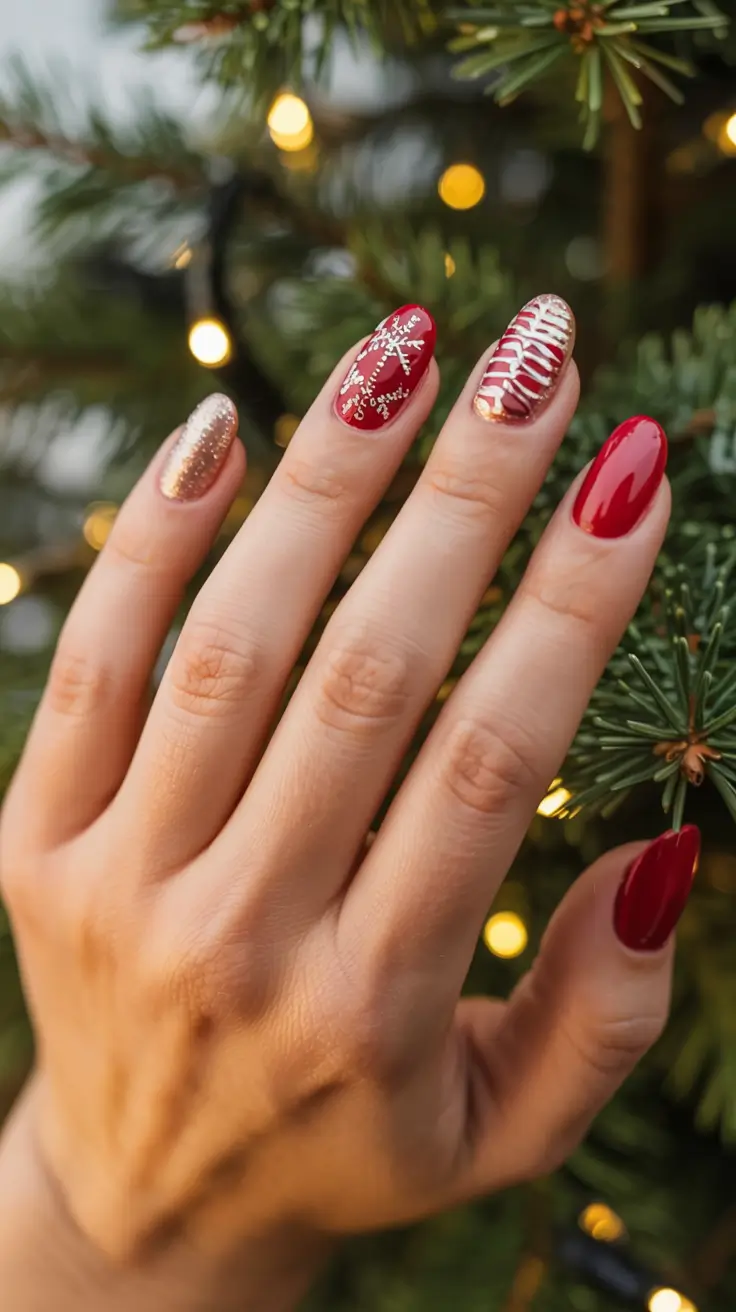 In the case of red christmas nails in almond or stiletto form, this gradient makes the hand look beautiful. It also balances in the shorter nails due to the alternating designs.